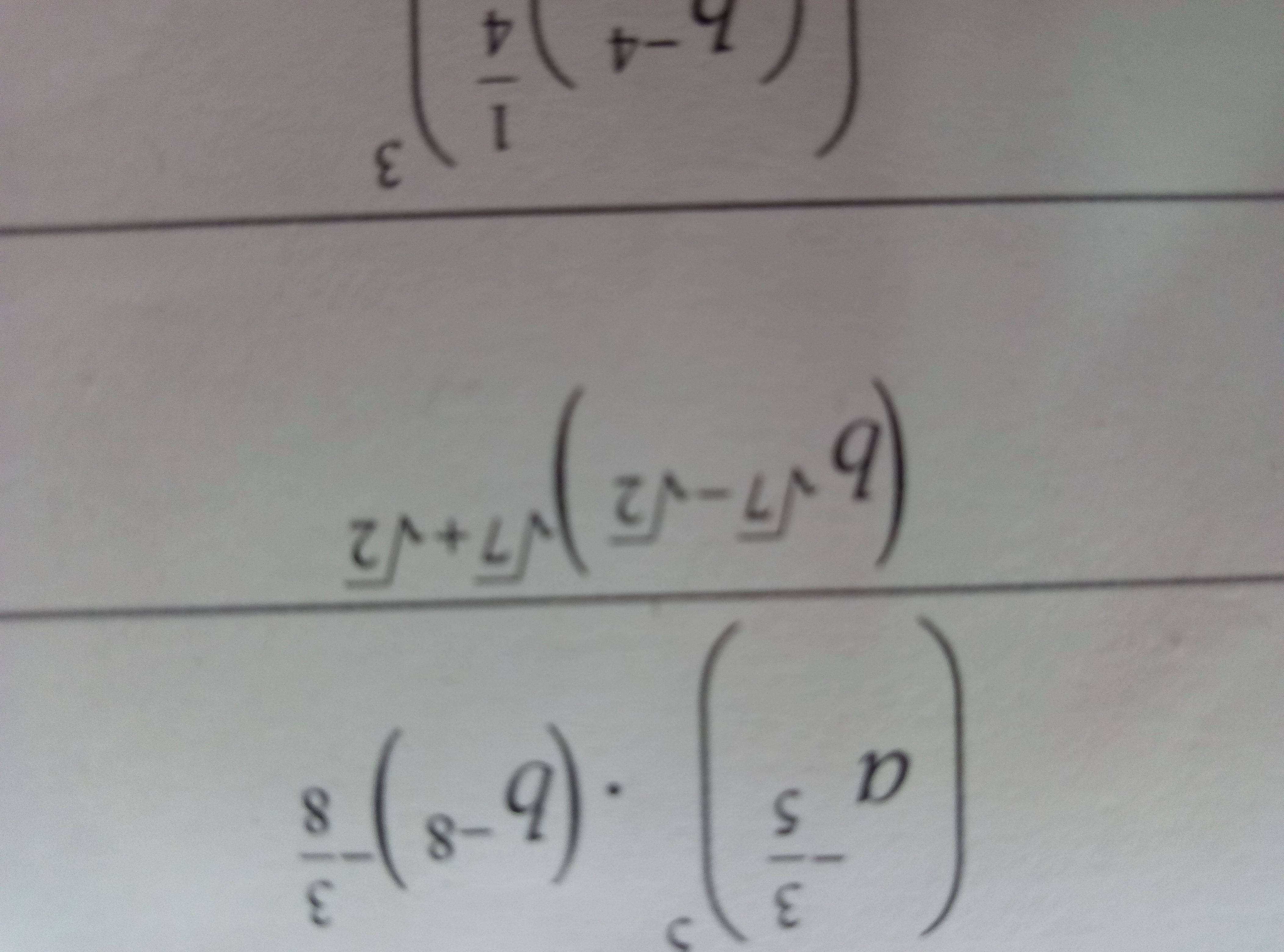 ({ {a}^{  - frac {3}{5} } })^{5}  times  ({ {b}^{ - 8} })^{  - frac{3}{8} }  =  {a}^{  - frac{3}{5} times 5 }  times  {b}^{  - frac{3}{8}  times 8}  =  {a}^{ - 3} times  {b}^{ - 3}  =  {(ab)}^{ - 3}  \  { ({b}^{ sqrt{7}  -  sqrt{2} } )}^{sqrt{7}  +  sqrt{2} }  =  {b}^{( sqrt{7}  -  sqrt{2} ) times ( sqrt{7}  +  sqrt{2} )}  =  {b}^{ { sqrt{7} }^{2}  -  { sqrt{2} }^{2} }  =  {b}^{7 - 2}  =  {b}^{5}  \  { {( {b}^{ - 4}) }^{( frac{1}{4} )} }^{3}  =  { ({b}^{ - 4} )}^{ frac{3}{4} }  =  {b}^{ - 3}  =  frac{1}{ {b}^{3} }