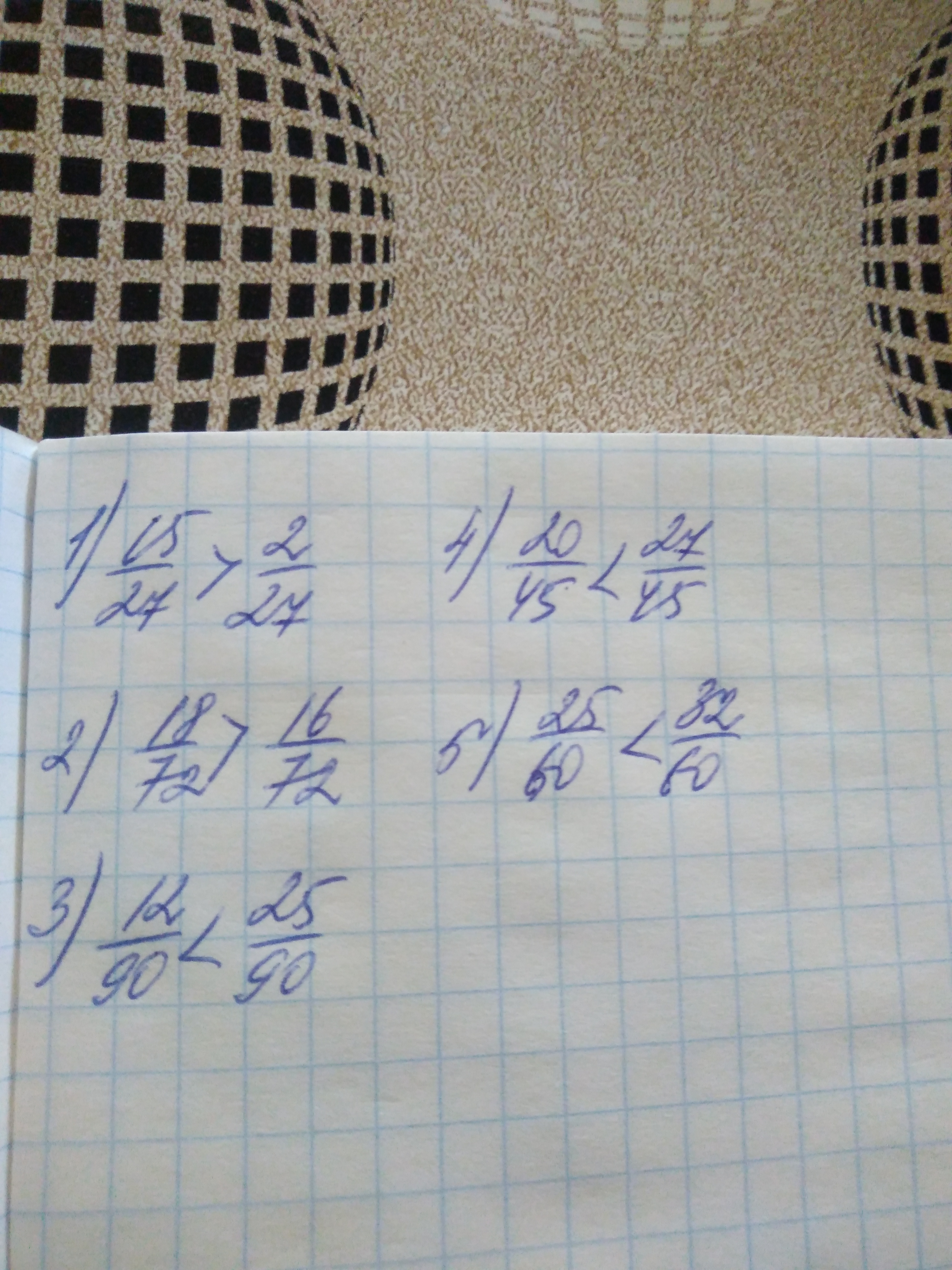 1) 5/9и 2/27 2)2/8 и 2/9 3) 2/15 и 5/18 4)4/9и 3/5 5)5/12 и 8/15 помогите сравнить дроби и распишите все в столбик , пожалуйста !