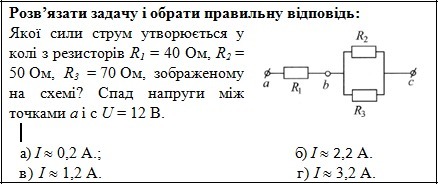 Якої сили струм утворюється у колі з резисторів R1 = 40 Ом, R2 = 50 Ом, R3 = 70 Ом, зображеному на схемі? Спад напруги між точками а і с U = 12 В.