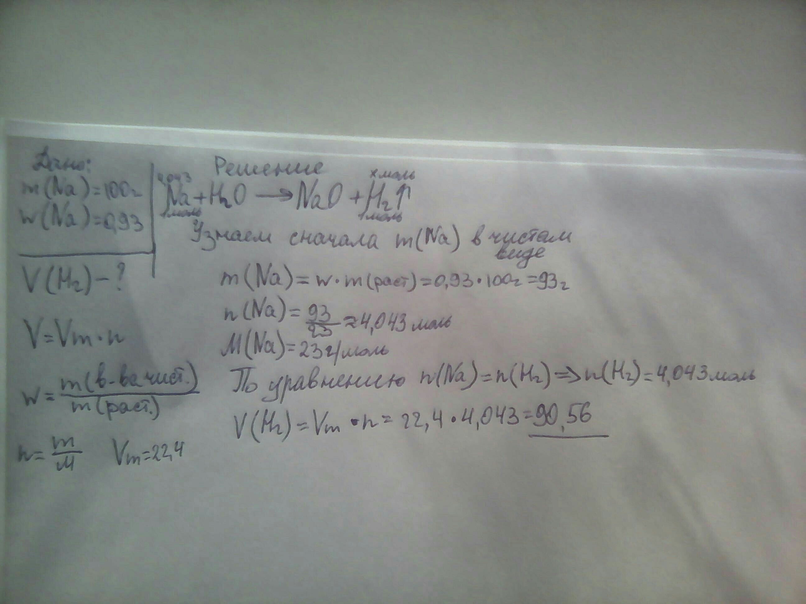 Рассчитать объем водорода в реакции na+h2o если m (na) 100г, W (Na) 0.93