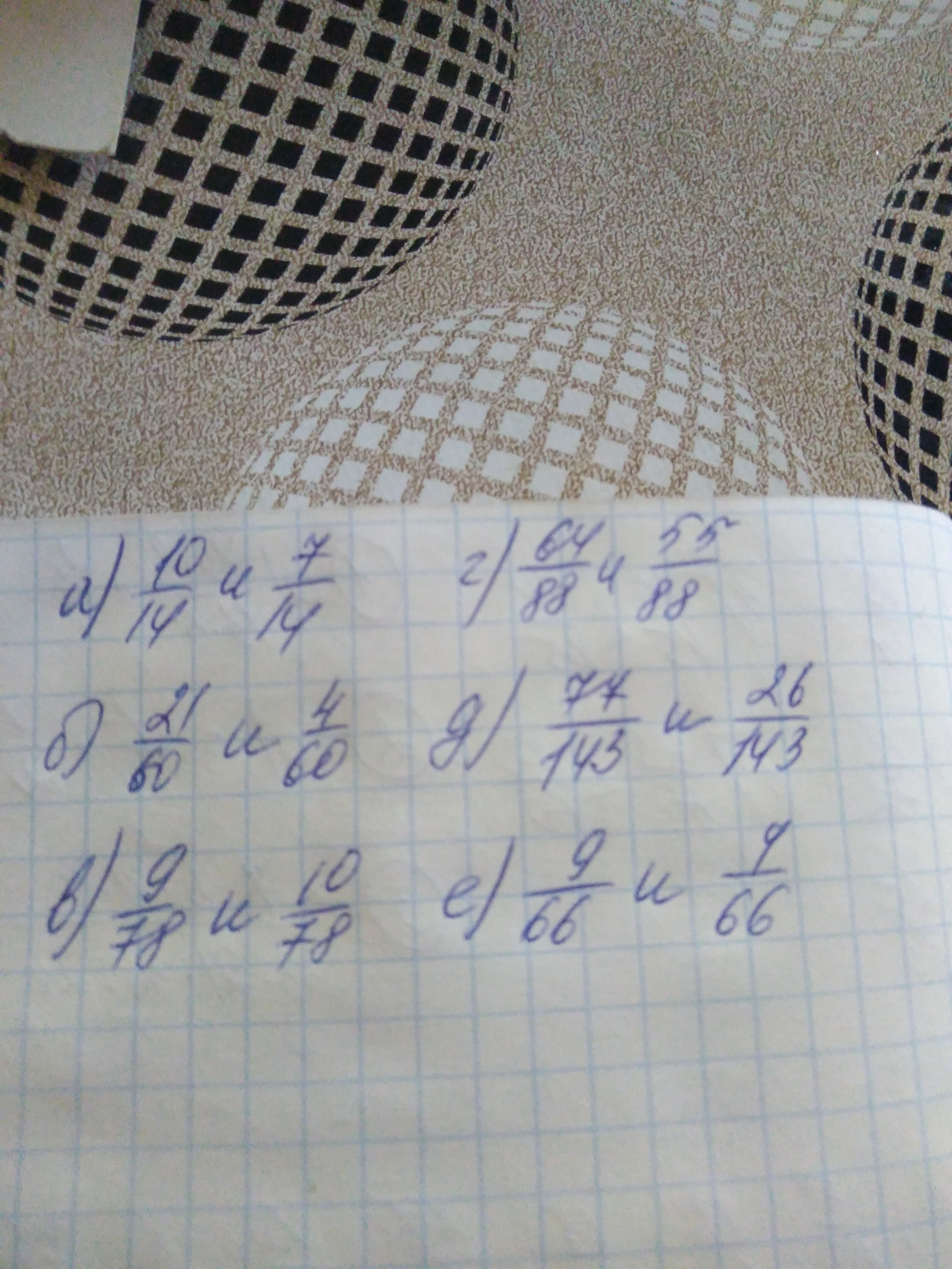 a) 10/14 и 7/14 ,б) 21/60 и 4/60, в) 9/78 и 10/78 г) 64/88 и 55/88 д) 77/143 и 26/143 е) 9/66 и 4/66