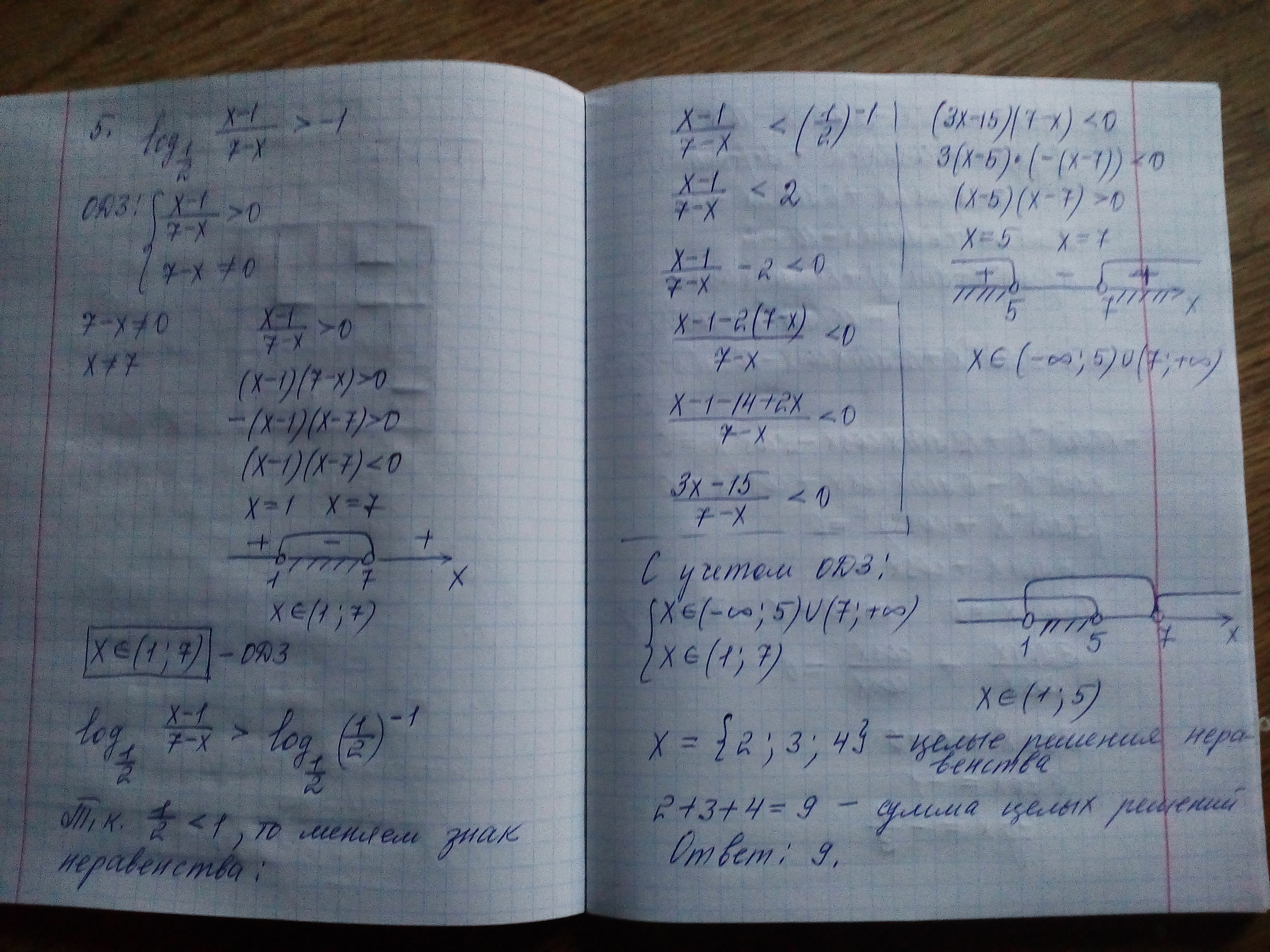 5. Найти сумму всех целых решений неравенства log(1/2) (x -1) / (7 - x) > - 1
