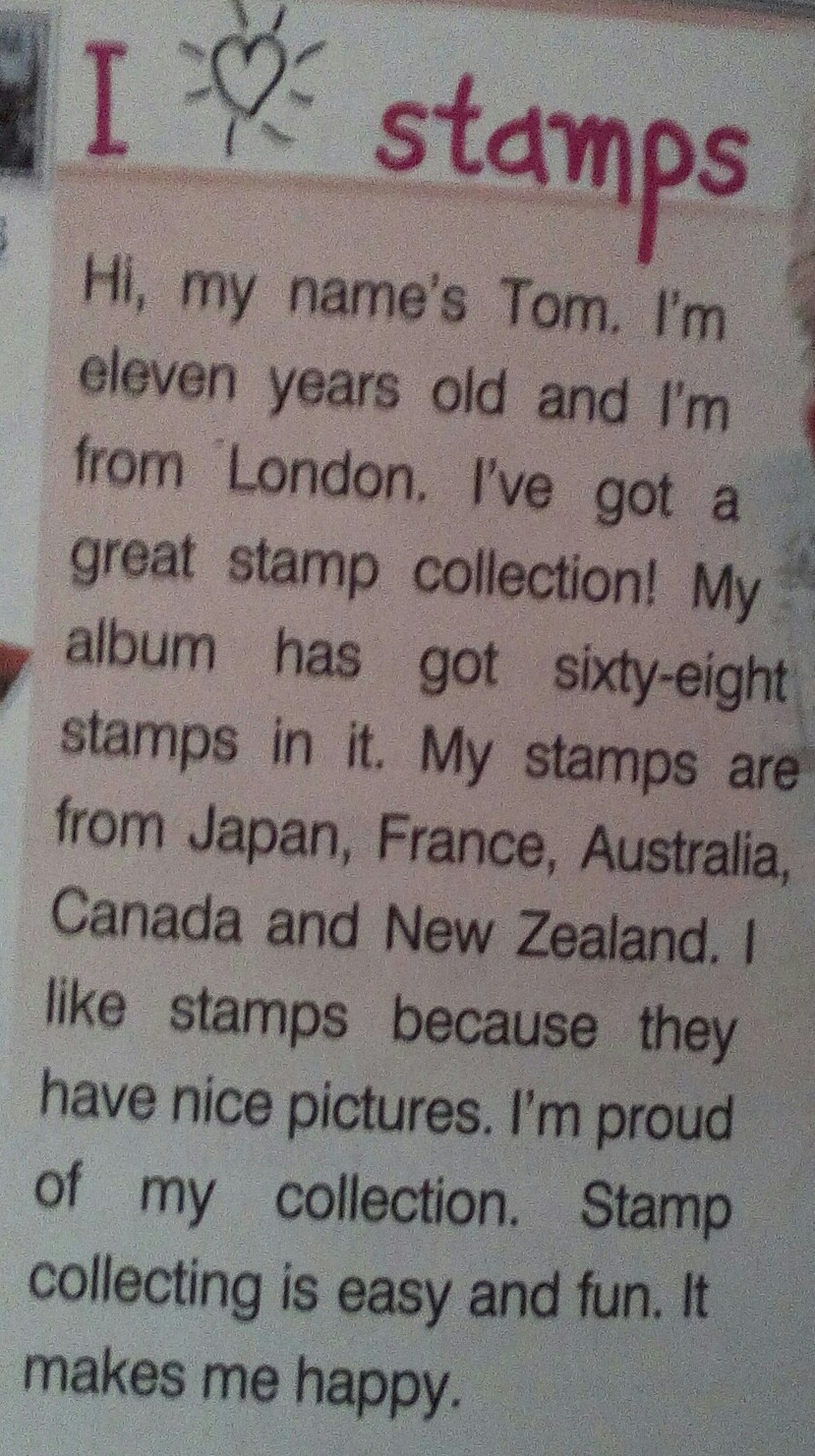 Привет меня зовут том . мне одиннадцать лет . я из Лондона У меня отличная коллекция штампов ! у моего альбома есть 68 марок .Мои марки из японии .Франции Австралии Канады и Новой Зеландии Мне нравятся марки потому что у них хорошие фотографии Я горжусь своей Коллекцией .Сбор штампов это легко и весело . это делает меня счастливым