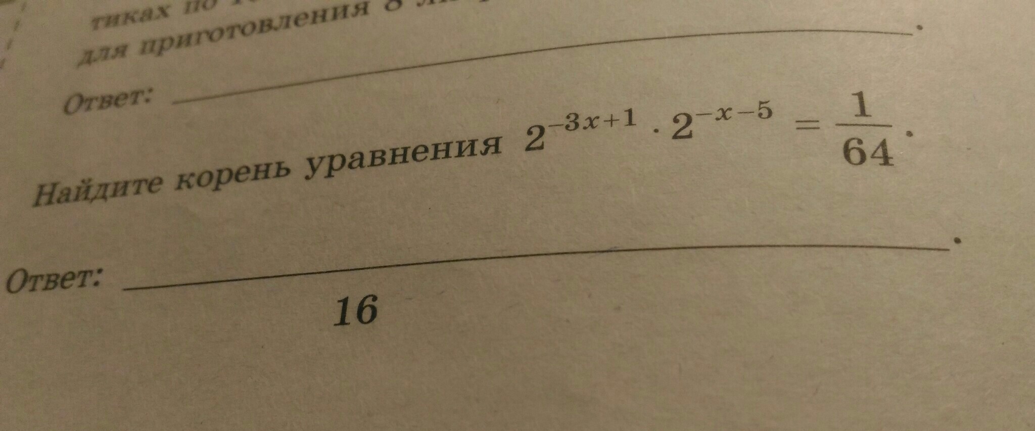 2^(-3x+1-x-5)=2^-6; 2^(-4x-4)=2^-6; -4x-4= -6; -4x= -6+4; -4x= -2; x=(-2)/(-4)=1/2. Ответ: x=1/2. ^- это степень.