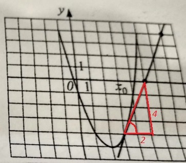 Значение производной равно угловому коэффициенту прямой k, то есть y'(x₀)=k=tga=4/2=2 . (см. рис.)