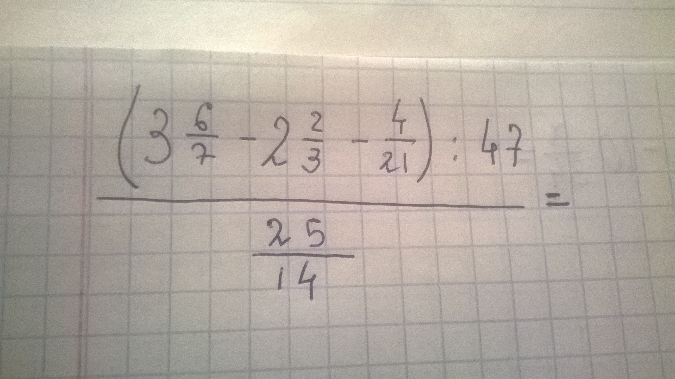 frac{(3 frac{18}{21}  - 2 frac{14}{21}  -  frac{4}{21} ) div 47}{ frac{25}{14} }  =  frac{1 div 47}{ frac{25}{14} }  =  frac{1}{47}  times  frac{14}{25}  =  frac{14}{1175}