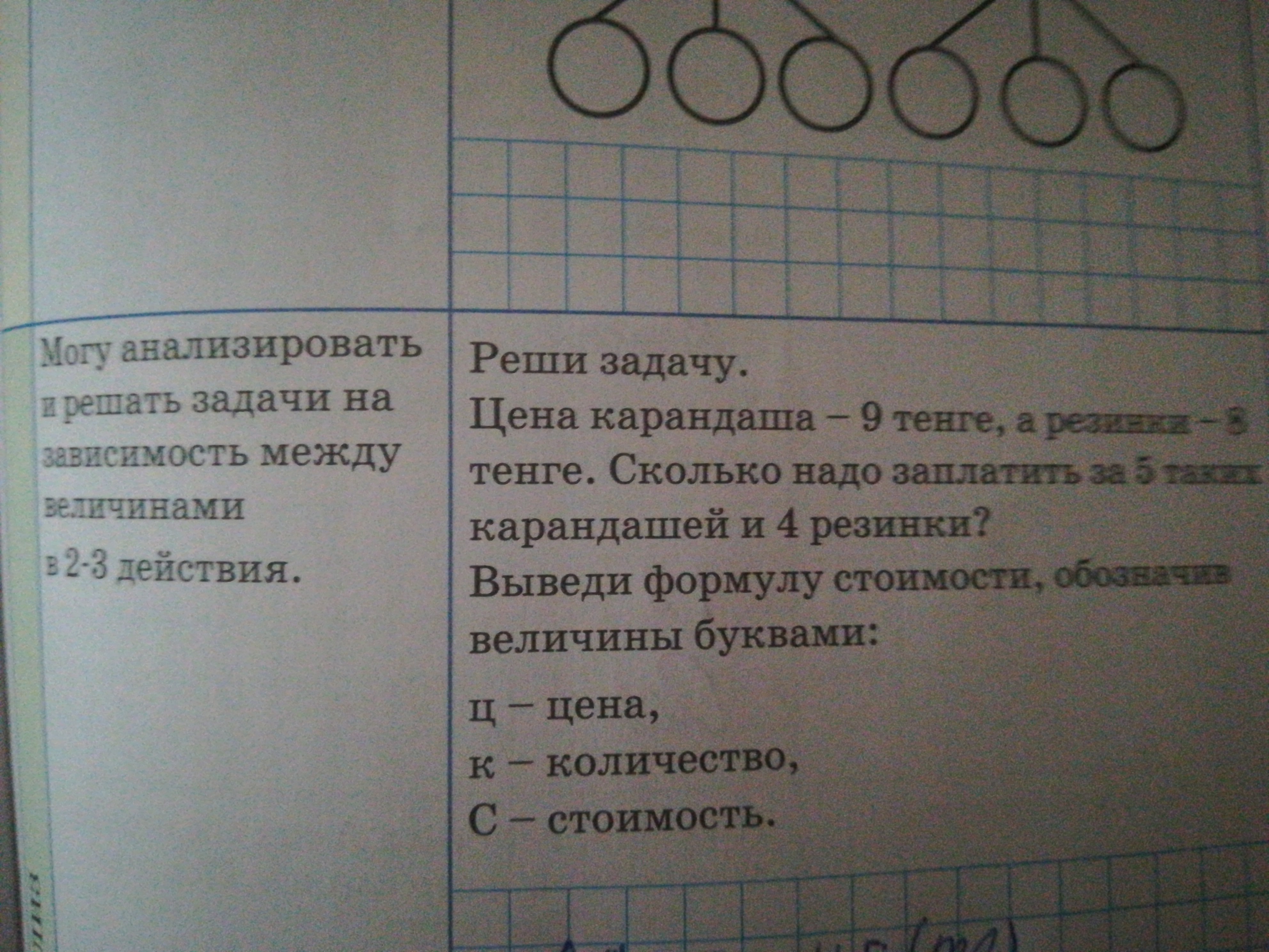 Задача! цена карандаша - 9 тенге, а резинки - 8 тенге. сколько надо заплатить за 5 таких карандашей и 4 резинки? вывели формулу стоимости, обозначил величины буквами: цена, к-количество, с-стоимость
