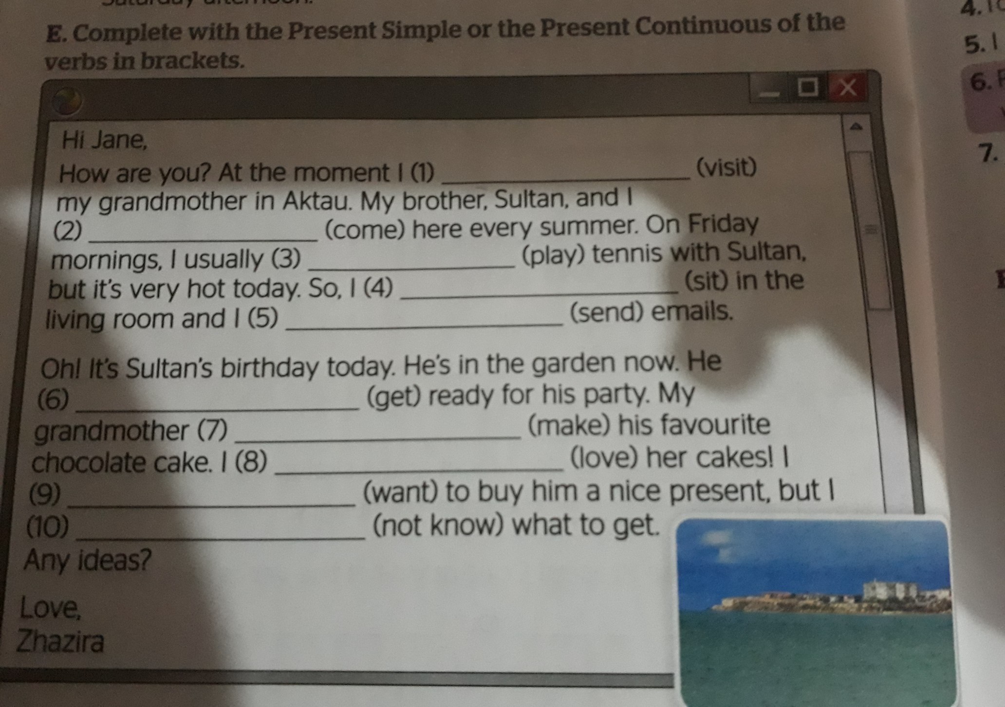 1)I’m visiting 2)come 3)play 4)I’m sitting,5)I’m sending 6)he is getting 7)is making 8)love 9)want 10)don’t know