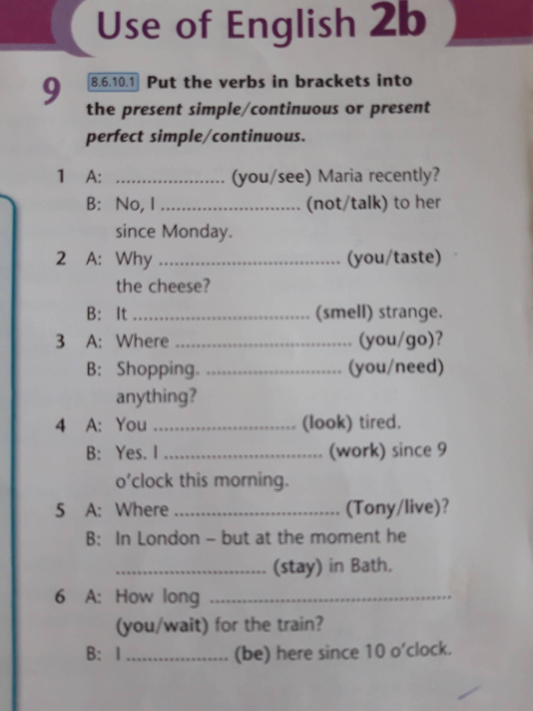 1. 1) Did you 2).I did not talk 2. 1)Did you taste 2) smelt 3. 1) did you go? 2) did you need 4. 1) look 2) worked 5. 1) does Tony 2) is staying 6. 1) have you been waiting 2) have been