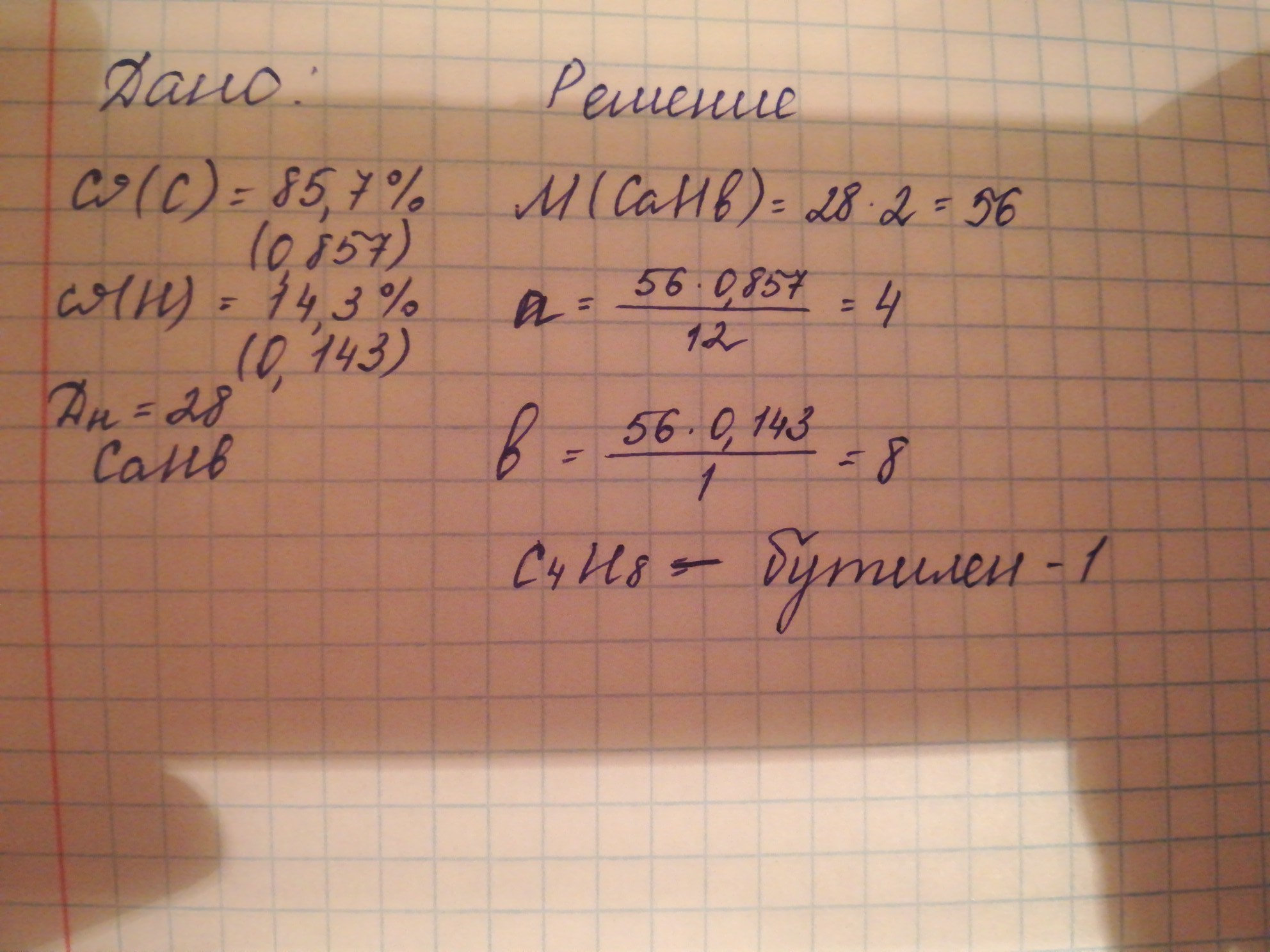 Выведите формулу вещества, содержащего 85,7% углерода и 14,3% водорода. Относительная плотность паров этого вещества по водороду равна 28