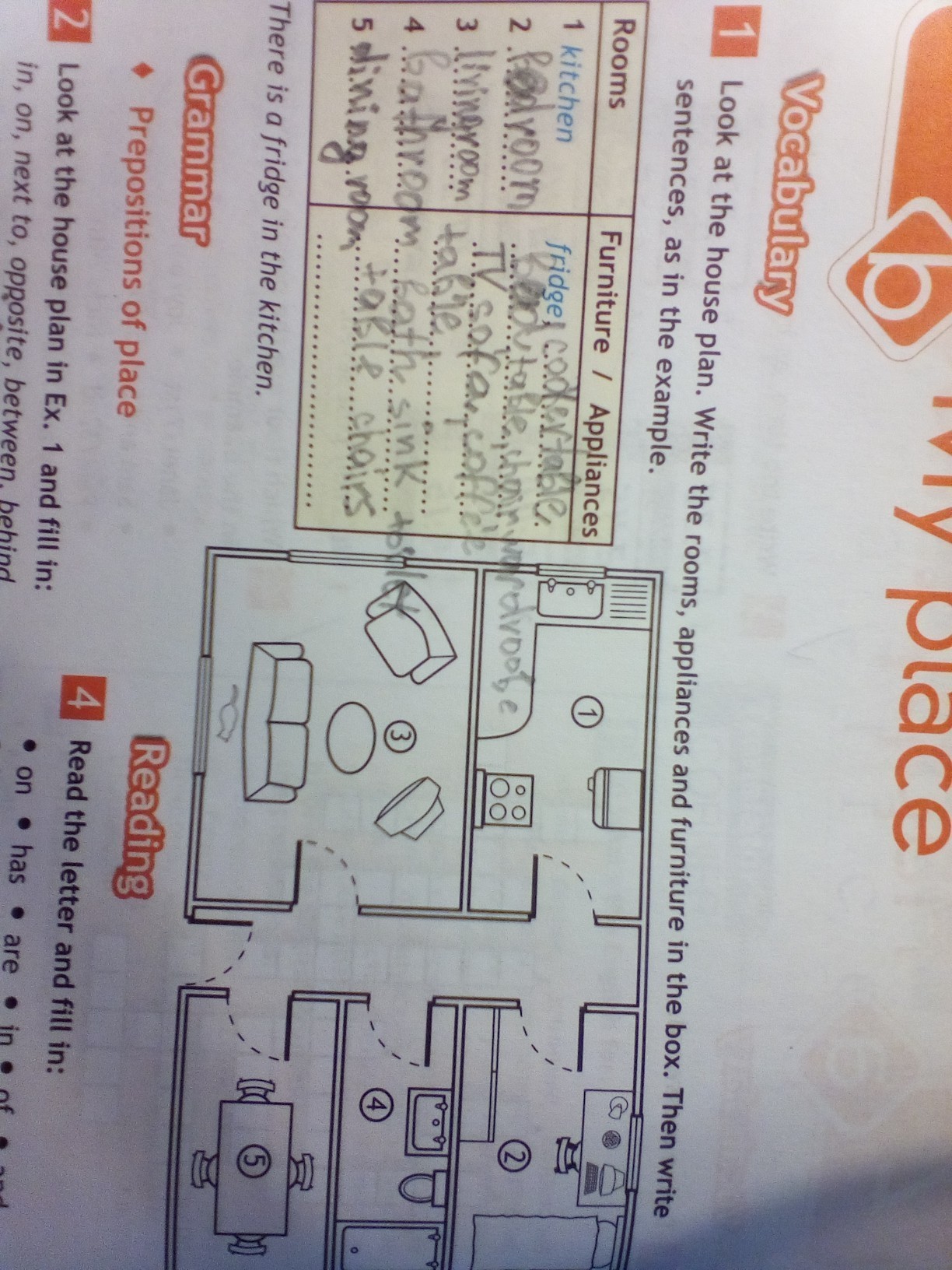 Look at the house plan.Write the rooms, appliances and furniturw in the box.Then write sentences, as in the example