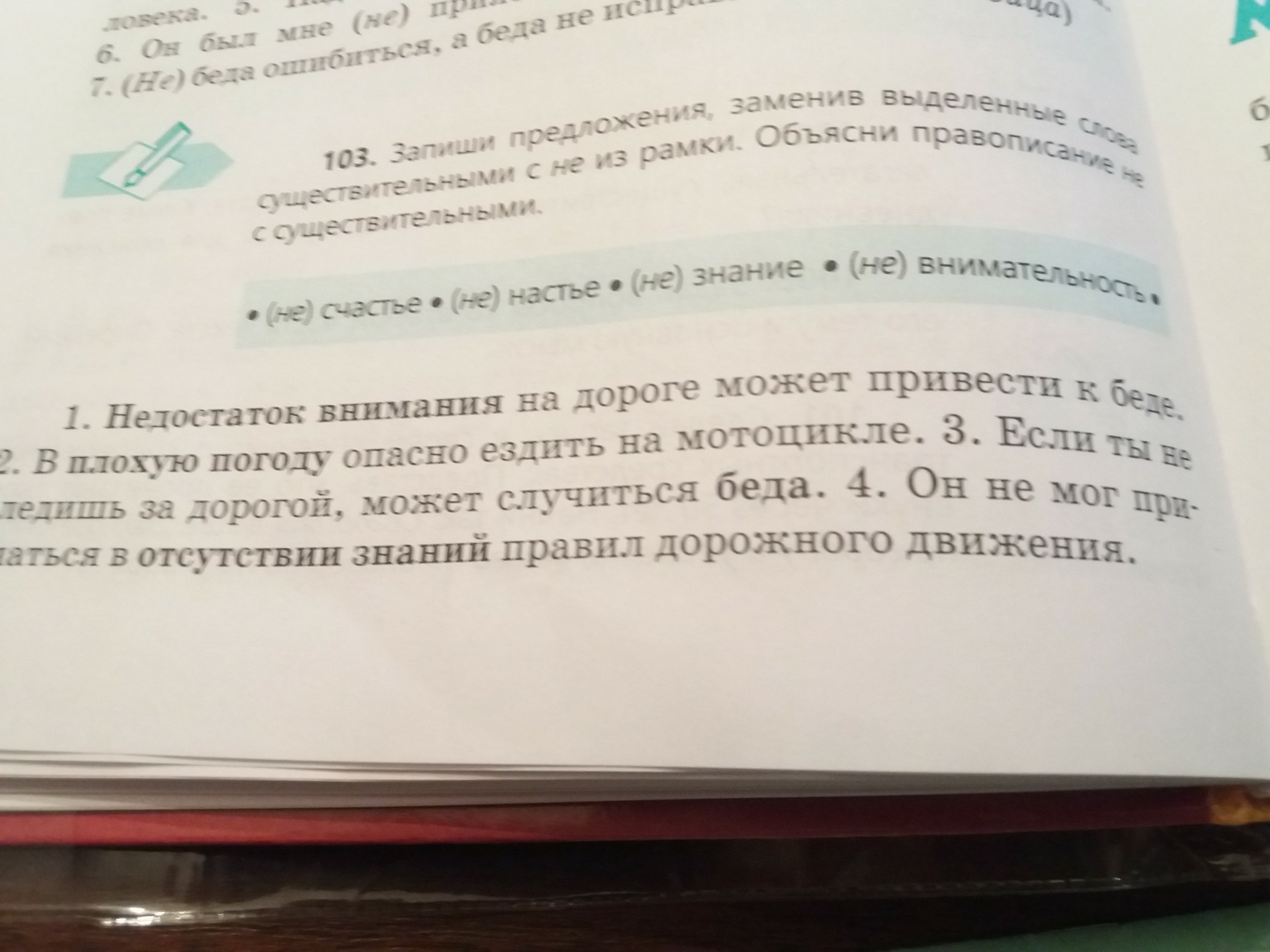 1.Невнимательность 2.ненастье3.несчастье4.незнание. все пишется слитно потому что эти слова без не не могут существовать