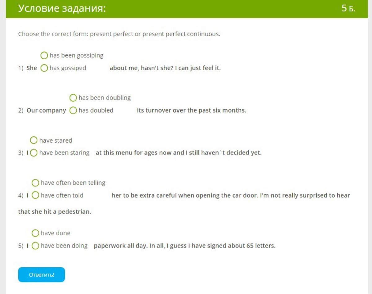 Выберите правильную форму: present perfect или present perfect continuous. О сплетничала 1) она о сплетничала обо мне, не так ли? Я могу просто чувствовать это. O удваивается 2) наша компания O удвоила свой оборот за последние шесть месяцев. O начали 3) O смотрели на это меню в течение многих лет, и я до сих пор не решил. O часто говорил 4) O часто говорил ей быть очень осторожной при открытии двери автомобиля. Я не удивлен, что она сбила пешехода. O сделали 5) IO делали документы весь день. Всего, я думаю, я подписал около 65 писем.