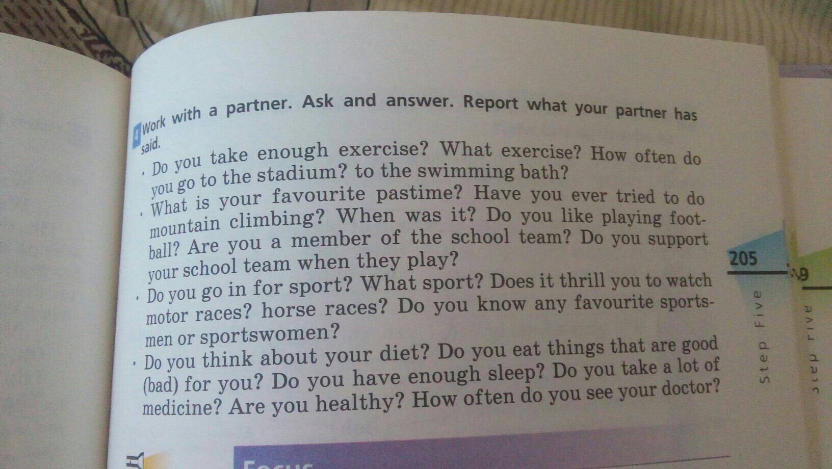 Какое упражнение? Как часто на стадион? в купальную ванну? sald У вас т, что такое наше любимое времяпрепровождение? Вы когда-нибудь пытались заняться лазанием? Когда это было? Вам нравится играть в ногу? Вы член школьной команды? Поддерживаете ли вы свою школьную команду, когда играете? Вы занимаетесь спортом? Какой вид спорта? Тебя волнует, что ты хочешь моторных гонок? лошадиные скачки? Вы знаете любимых спортсменов или спортсменок? Вы думаете о своей диете? Вы едите то, что хорошо (плохо) для вас? Вам достаточно спать? Вы принимаете много лекарств? Ты здоров? Как часто вы видите своего врача?