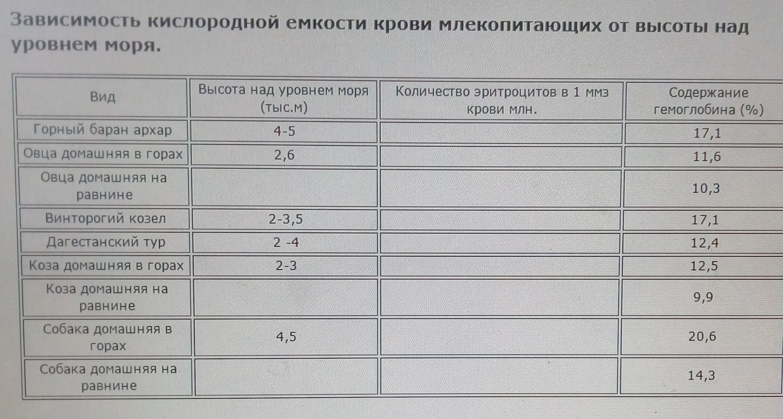 7.Пользуясь таблицей «Зависимость кислородной емкости крови млекопитающих от высоты над уровнем моря», а также используя знания из курса биологии, ответьте на следующие вопросы:
