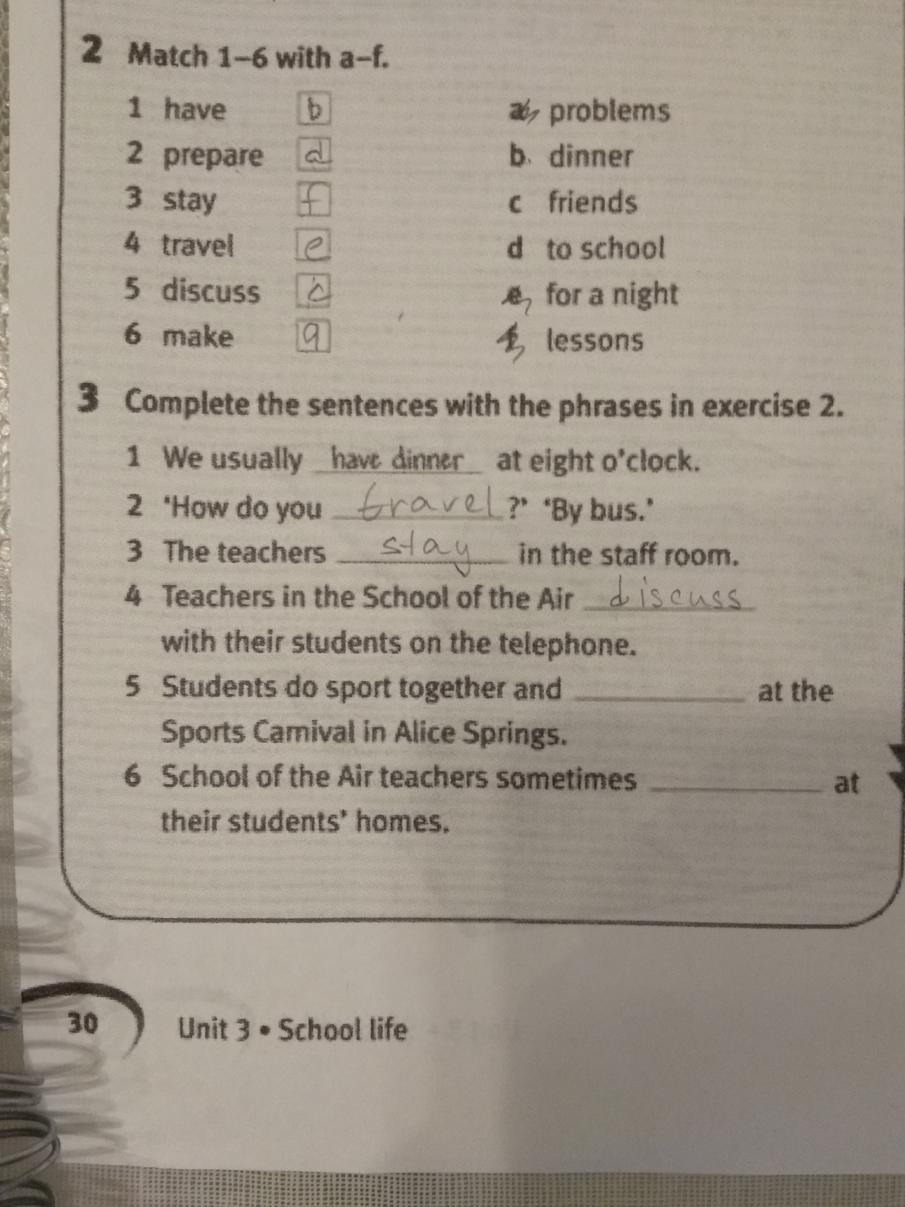 3. 2. travel to school 3. prepare lessons 4. discuss problems 5. make friends 6. stay for a night