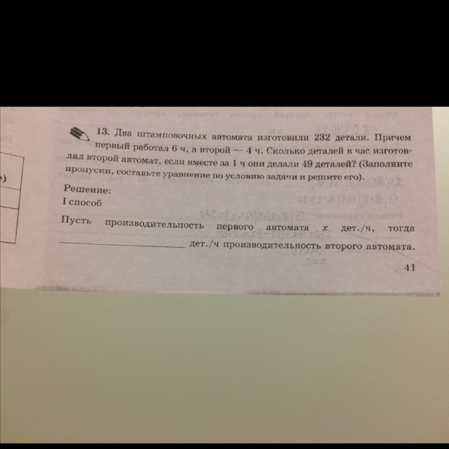Два штамповочных автомата изготовили 232 деталию Причем первый работал 6 ч, а второй - 4 чю Сколько деталей в час изготовлял второй автомат , если вместе за 1 ч они делали 49 деталей ?