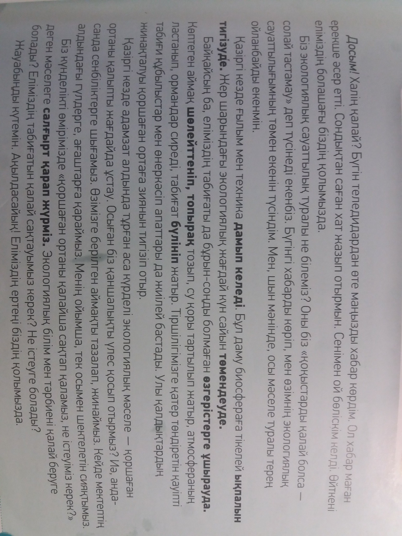 Сейчас задача человечество связанной экологии - держать природу в хорошем состояний. А сколько старании для этого мы делаем? Но иногда всё же мы очищаем природу. Место, в котором мы родились, мы должны её уважать, чистить. Иногда всё же я ухаживаю за растениями. Я думаю, что мы только этим и должны заниматься. В нашем списке также должно быть "уважать окружающий мир". Как мы должны изменить ум и уважение к экологии? Как мы должны сохранить природу нашей страны? Что мы можем сделать?