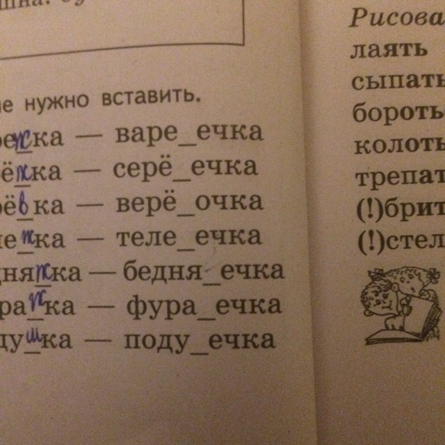 ВареЖечка, серёЖечка, верёВочка, телеЖечка, бедняЖечка, фураЖечка, подуШечка.