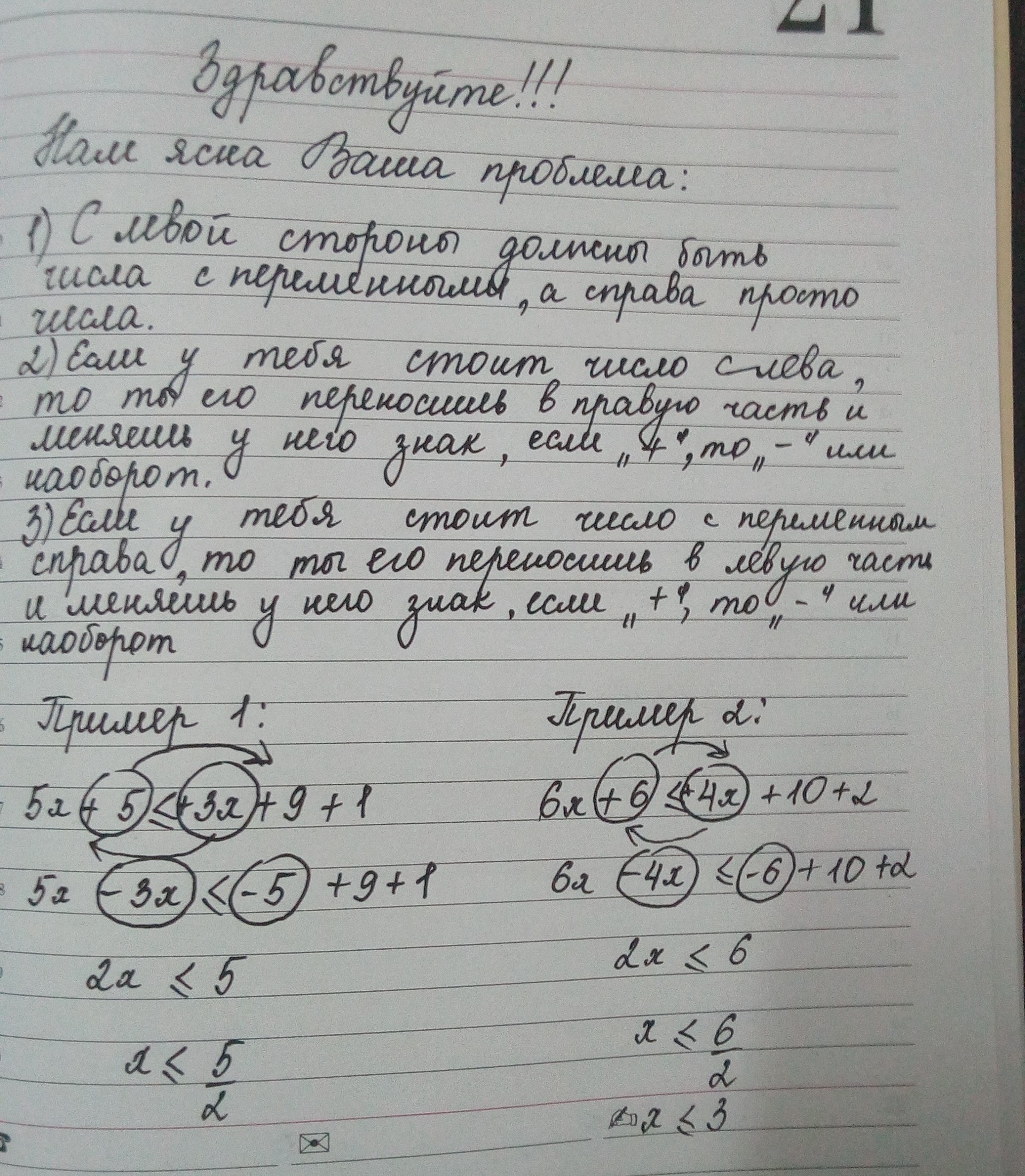 В каких случаях знаки плюс и минус в примерах а меняются на противоположные, а в каких случаях не меняются?Помогите понять... Все знаю, что на левой стороне должны быть цифры с x,а на правой обычные цифры, и дело в том то что я понимаю, что и где и знаю как решать, но не понимаю в каких случаях ставить +,а в каких -.Это единственная моя проблема. Помогите, спасити, хэлп ми, например дан пример :5х+5≤3x+9+1, потом моя подруга решила так :5х-3х≤9+1-5..И я не могу понять как она меняет знаки? Те плюс и минус