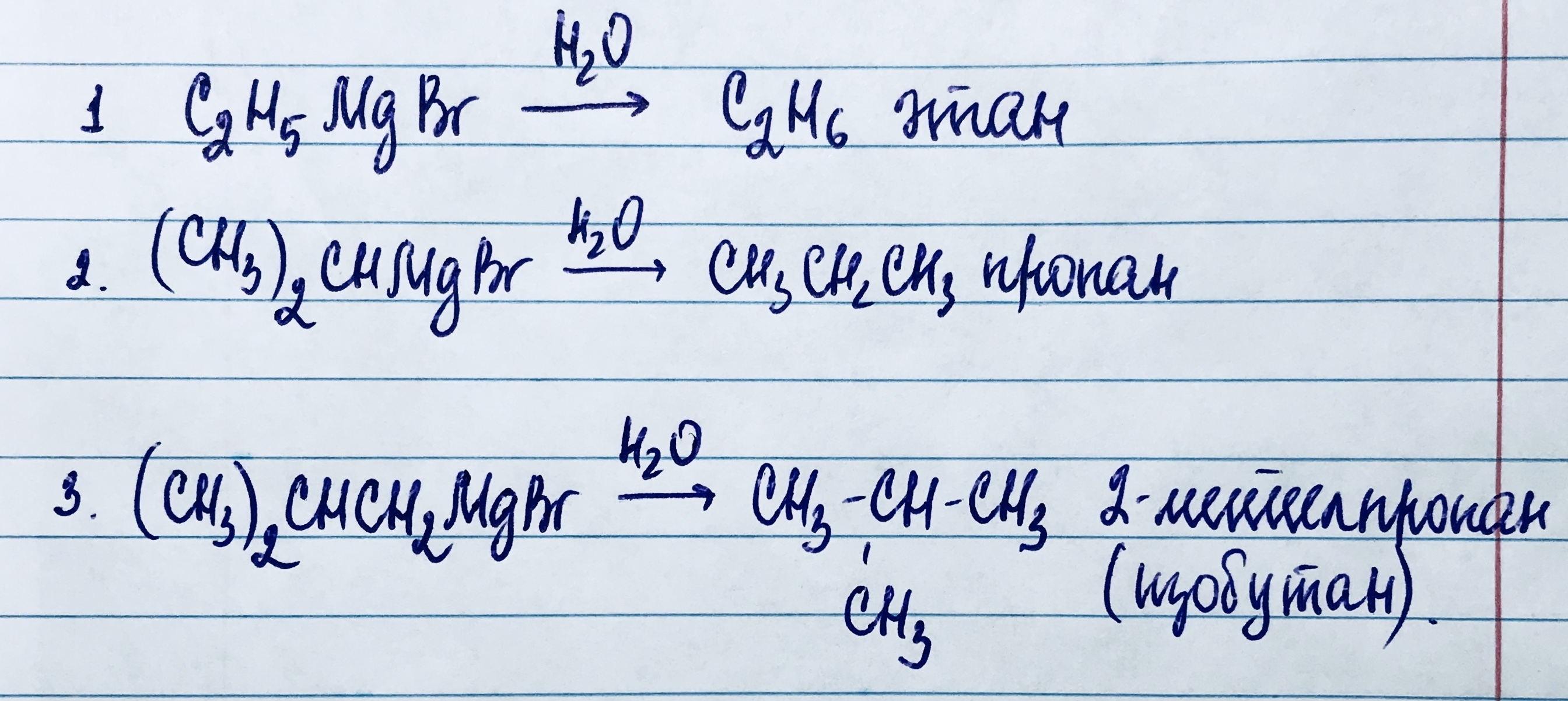 какие углеводороды получаются при взаимодействии с водой ? 1.бромистого этилмагния 2.бромистого изопропилмагния 3.бромистого изобутилмагния