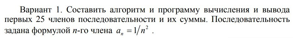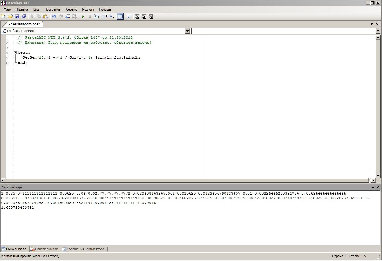 SeqGen(25, i -> 1 / Sqr(i), 1).Println.Sum.Println