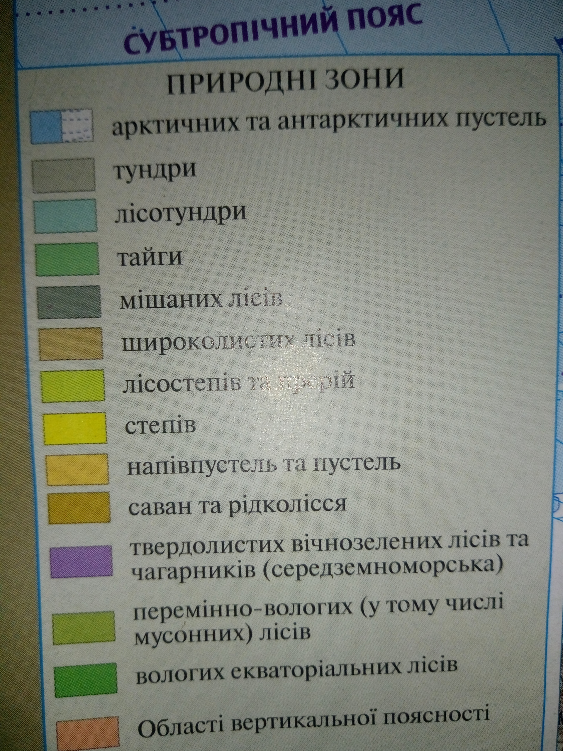 Арктические пустыни,Тундра,Лесотундра,Леса,Лесостепи,степи,полупустыни,пустыни,субтропики