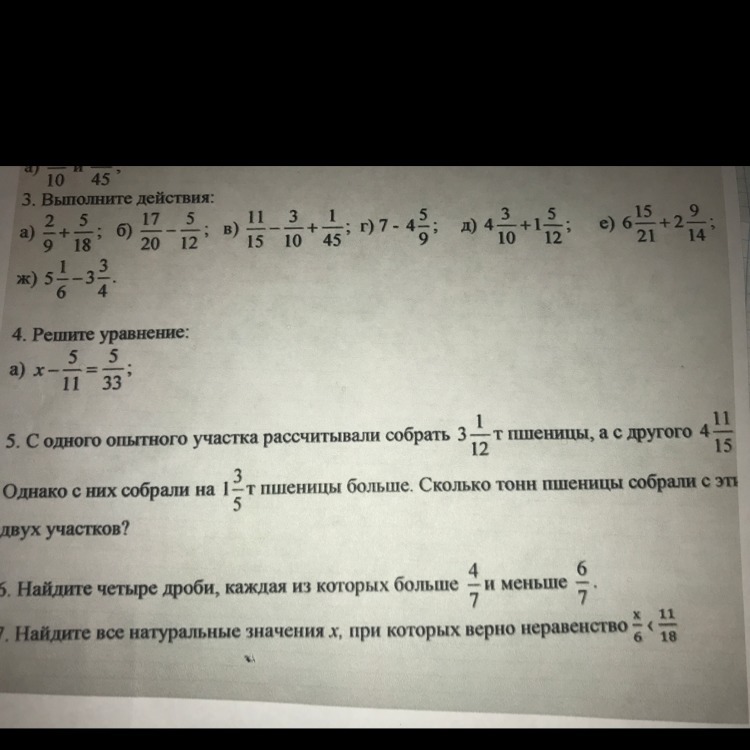 5. Найдём количество пшеницы, которое планировали собрать. Для этого сложим дроби, превратив их в неправильные и приведя к общему знаменателю 60: 13/12 + 71/15 = (65 + 284)/60. После этого прибавим разницу между тем, что планировалось и что получили: 349/60 + 8/5 = (349 + 96)/60 = 445/60 = 7 целых 5/12.