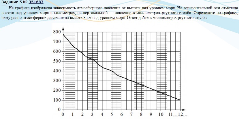 На графике изображена зависимость атмосферного давления от высоты над уровнем моря. На горизонтальной оси отмечена высота над уровнем моря в километрах, на вертикальной — давление в миллиметрах ртутного столба. Определите по графику, чему равно атмосферное давление на высоте 8 км над уровнем моря. Ответ дайте в миллиметрах ртутного столба