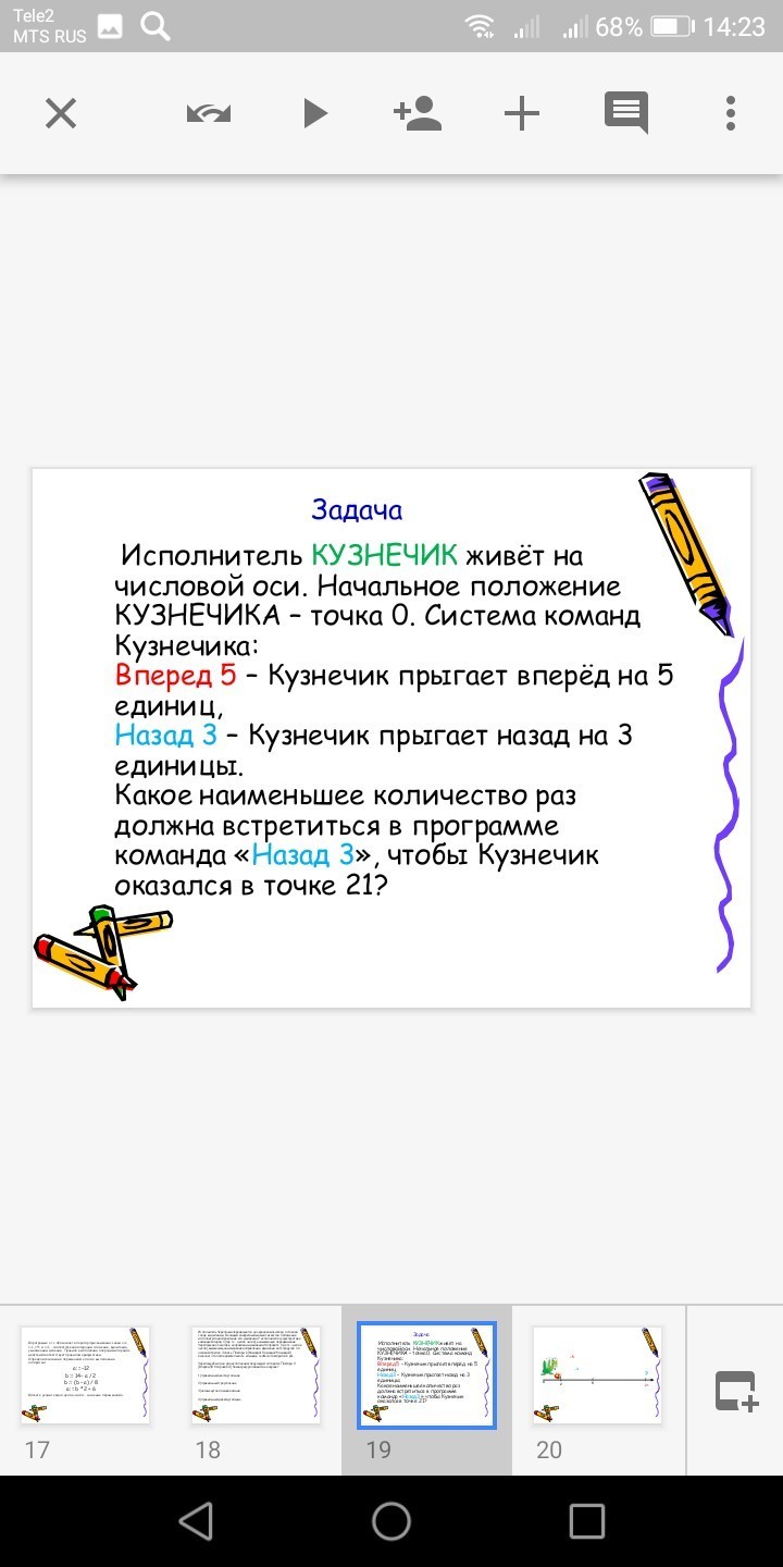 1. Три раза - Кузнечик должен 6 раз выполнить команду Вперёд5 и три раза Назад3