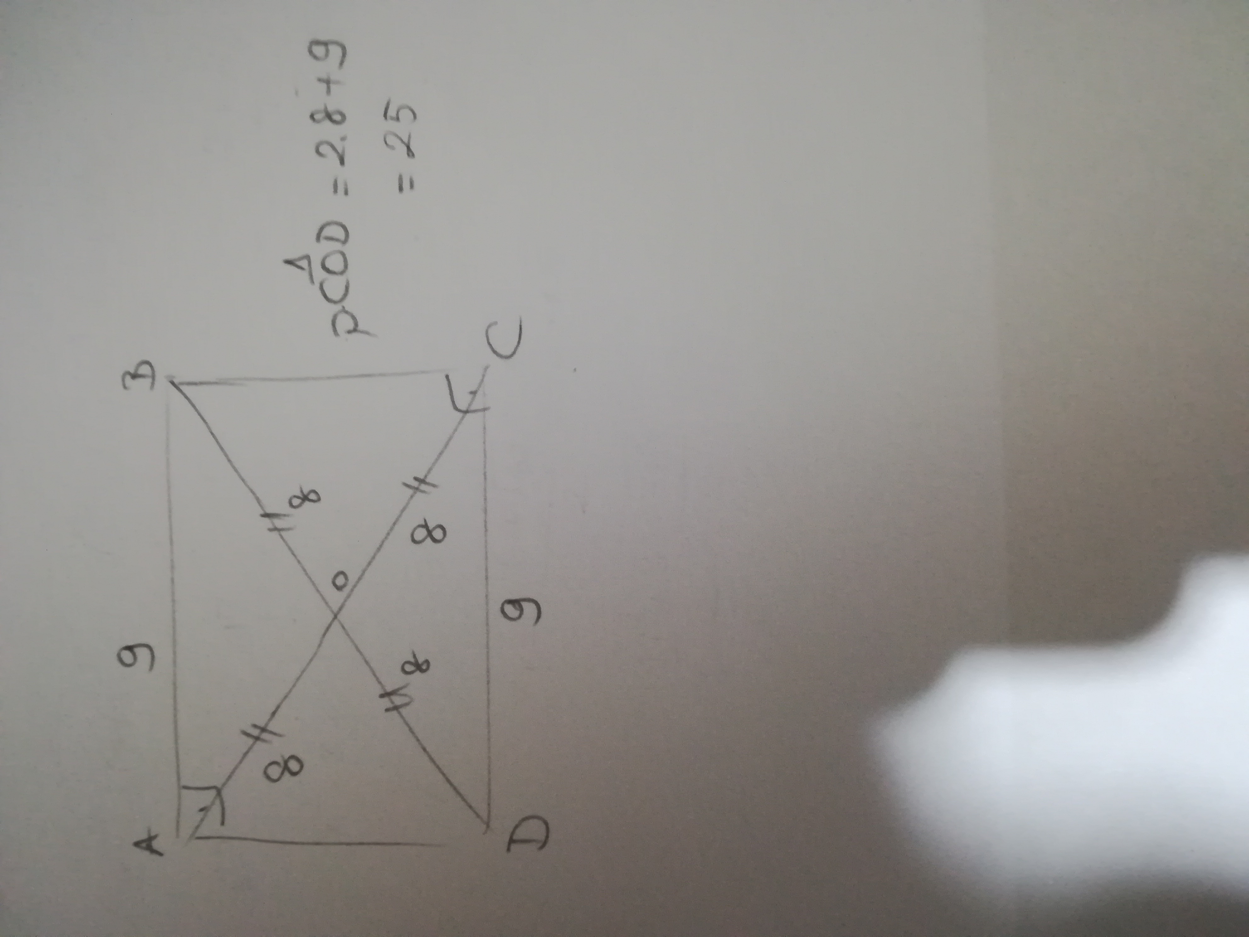 В прямоугольнике ABCD диагонали пересекаются в точке О, AB=9см, AC=16см. Найдите периметр треугольника COD.