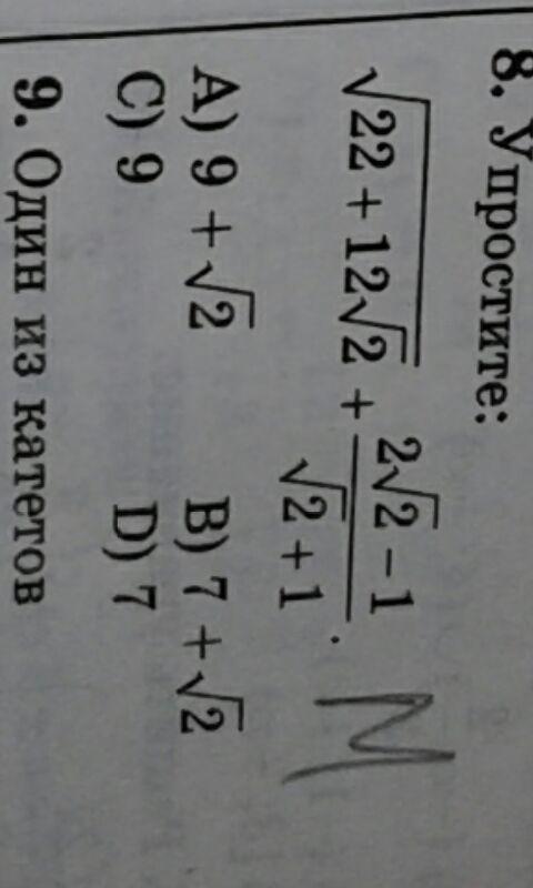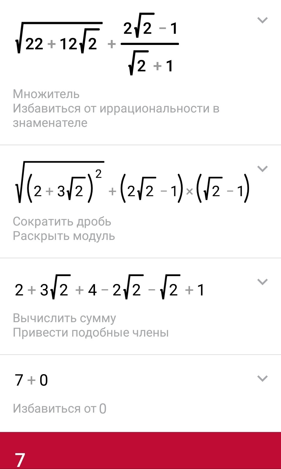 1. √(22+12√2)=√(18+2*2*3*√2+4)=√(3√2)²+2*2*3√2+2²)=√(3√2+2)²=3√2+2.