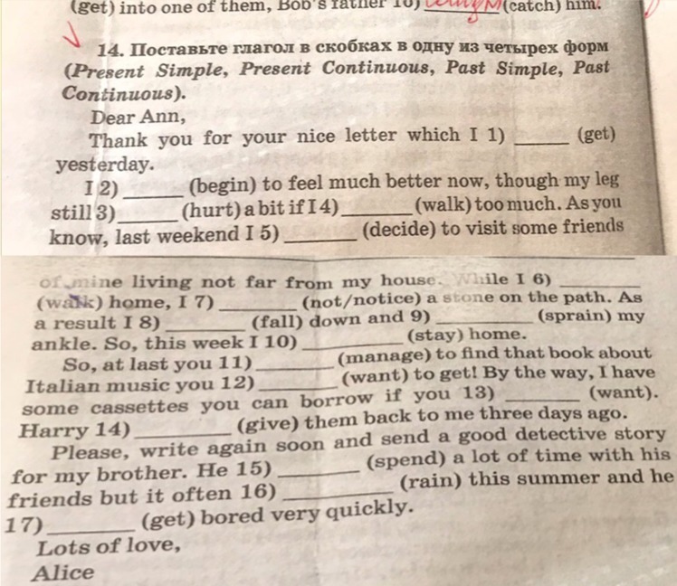 1) got 2)am beggining 3)hurts 4)walk 5)decided 6)was walking 7)didn't notice 8)fell 9)sprained 10)am staying 11)managed 12)wanted 13)wanted 14)gave 15)spends 16)rains 17)gets