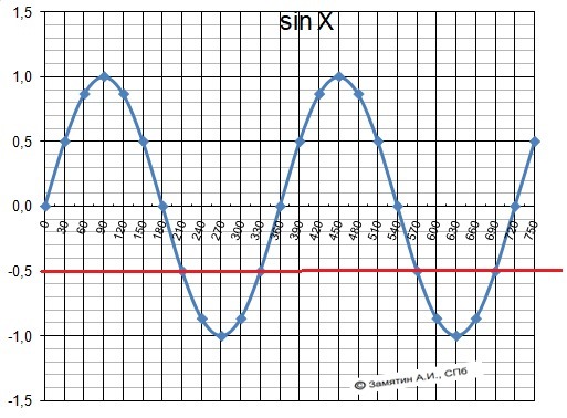 sin 30° = sin π/6 = +0.5 и sin(-30°) = sin 330° = - 0.5.