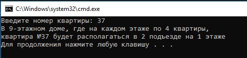 Console.WriteLine("В {0}-этажном доме, где на каждом этаже по {1} квартиры, nквартира №{2} будет располагаться в {3} подъезде на {4} этаже", ET, KV, N, Npd, Net);