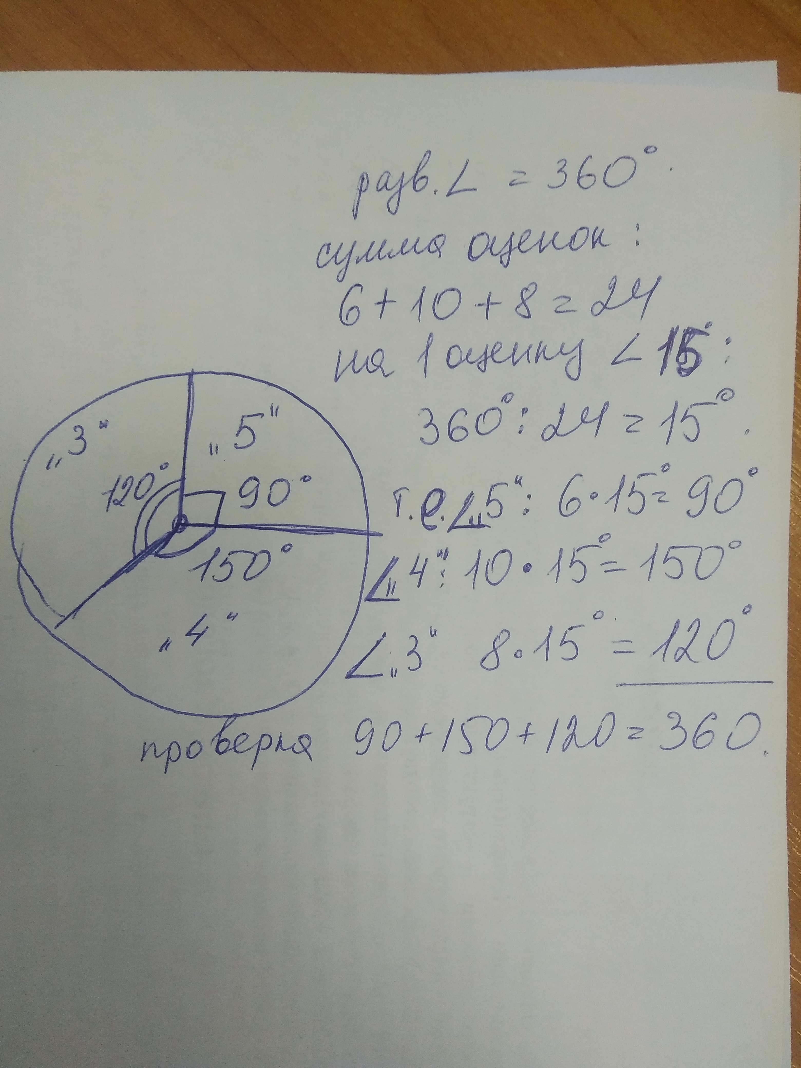 За контрольную работу учащиеся 9 класса получили 6 отметок "5", 10 отметок "4", 8 отметок "3". Других отметок не было. Постройте круговую диаграмму по этим данным.