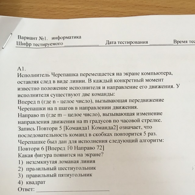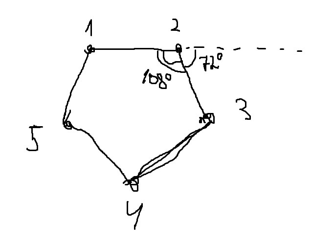 Поворот 72 градуса по часовой стрелке. Внутренний угол фигуры = 180 - 72 - 108. У пятиугольника как раз такой угол и есть.