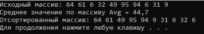 Console.WriteLine("Среднее значение по массиву Avg = {0}", avg);