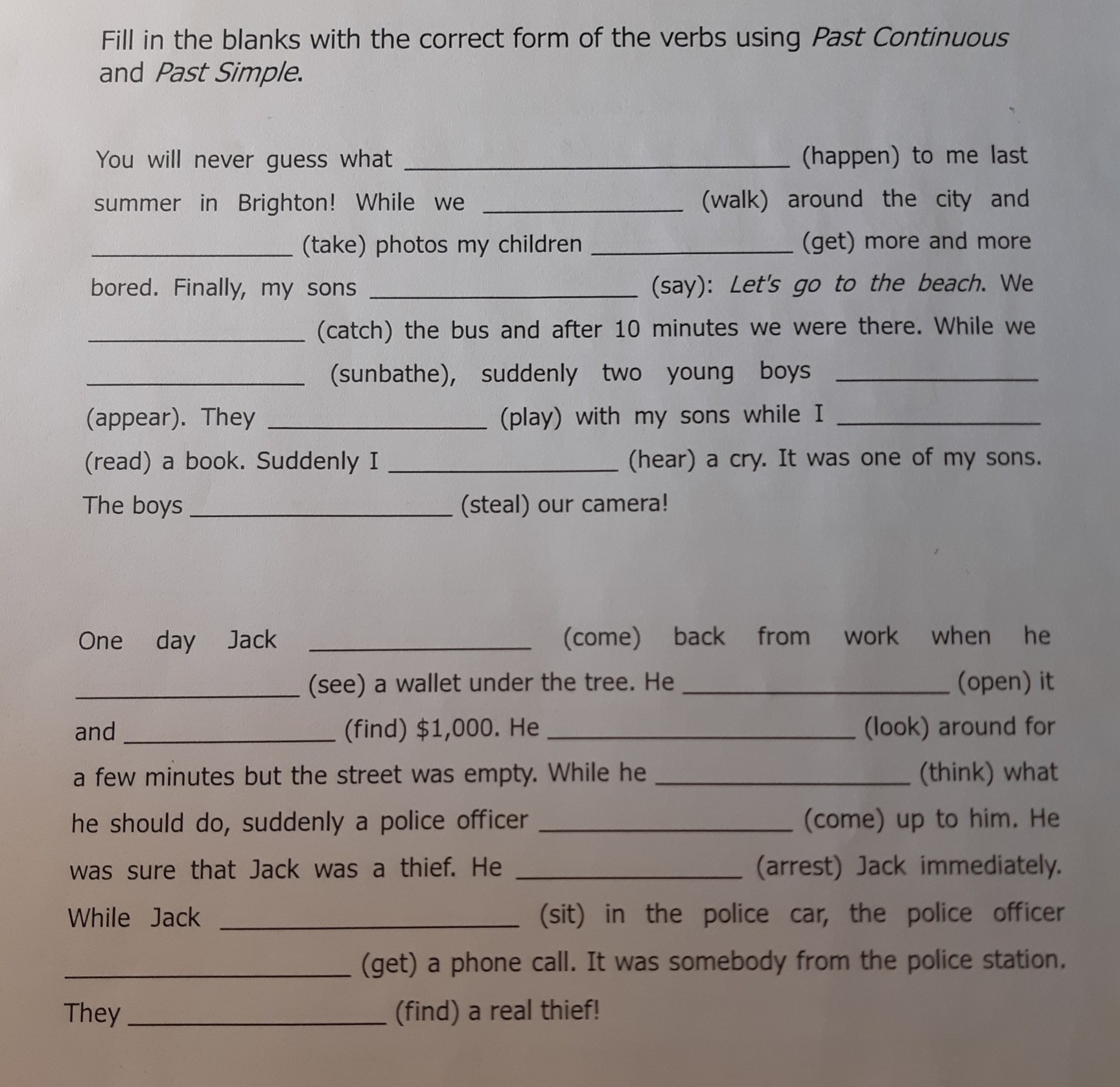 1.happened 2.were walking 3.were taking. 4.were getting. 5.said 6.caught 7.were sunbathing 8.appeared 9.were playing 10.was reading 11.heared 12.stole. 13.was coming 14.saw 15.opened 16.found 17.was looking 18.was thinking. 19.came 20.arrested 21.was sitting. 22.got 23.found
