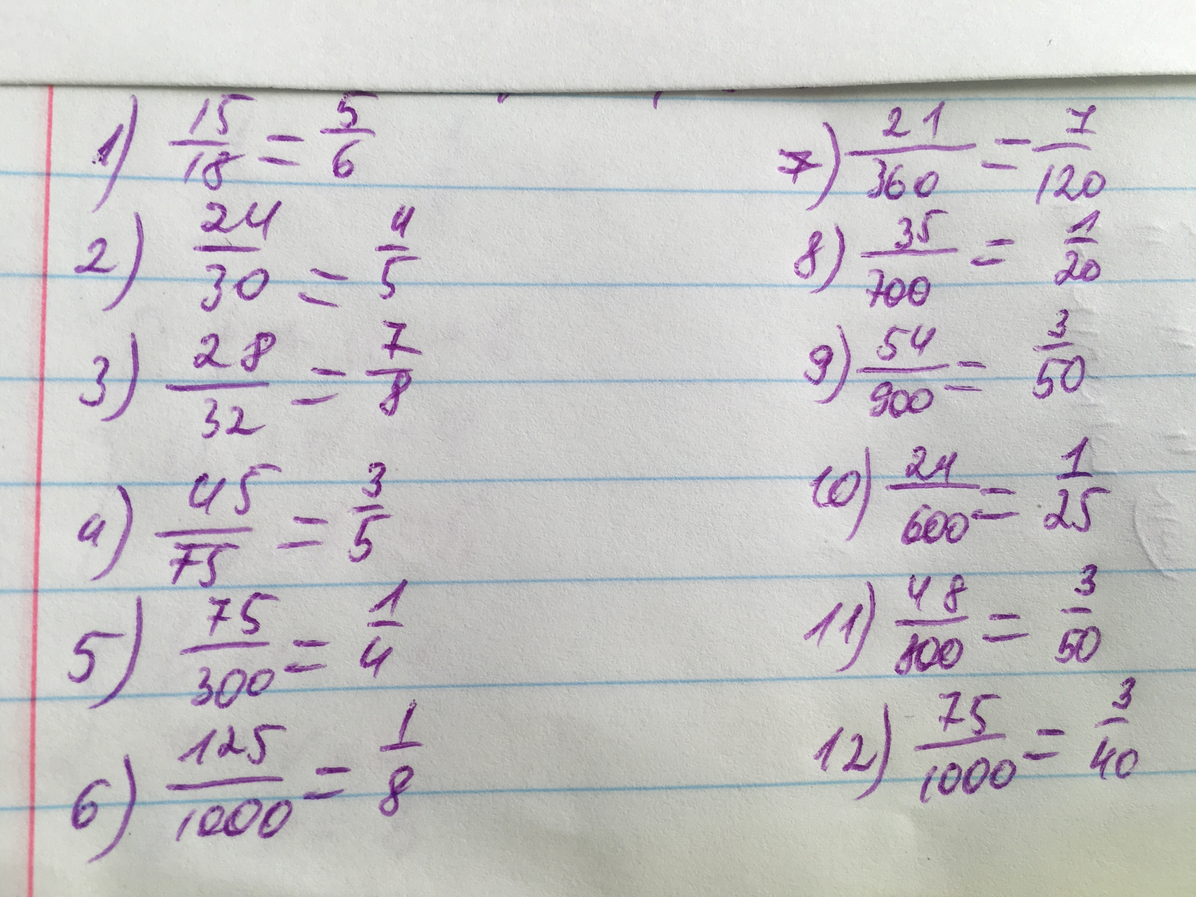 сократите дробь 15/18 24/30 28/32 45/75 75/300 125/1000 21/360 35/700 54/900 24/600 48/800 75/1000Дааамммм много баллооов решите пжж