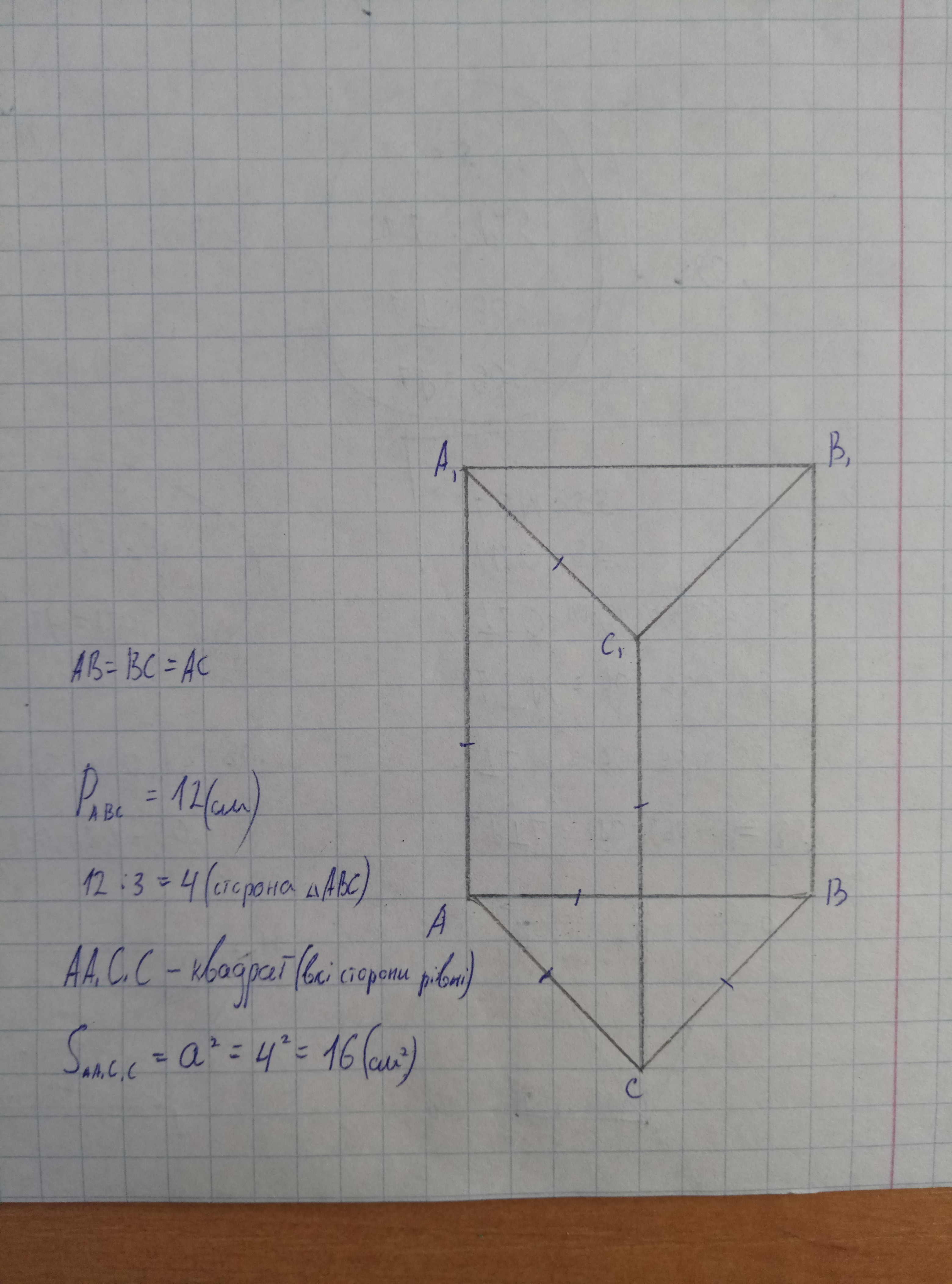 Периметр основи правильної трикутної призми дорівнює 12 см. Обчисліть площу бічної грані, якщо відомо, що вона є квадратом.