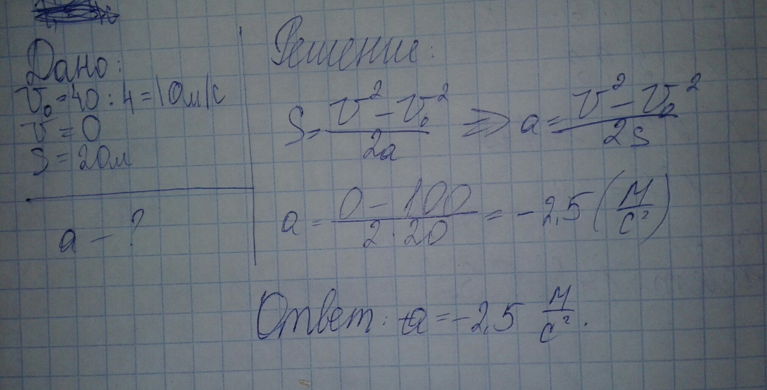 Автомобиль движется равномерно 40м проходит за 4с. После автомобиль начинает торможение до полного состояния. Определите ускорение автомобиля если тормозной путь автомобиля 20 м.