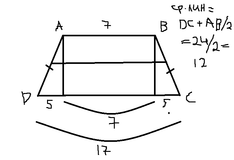 в равнобедреной трапеции высота делит большее основание на отрезки 5и12см надо найти сред. линию