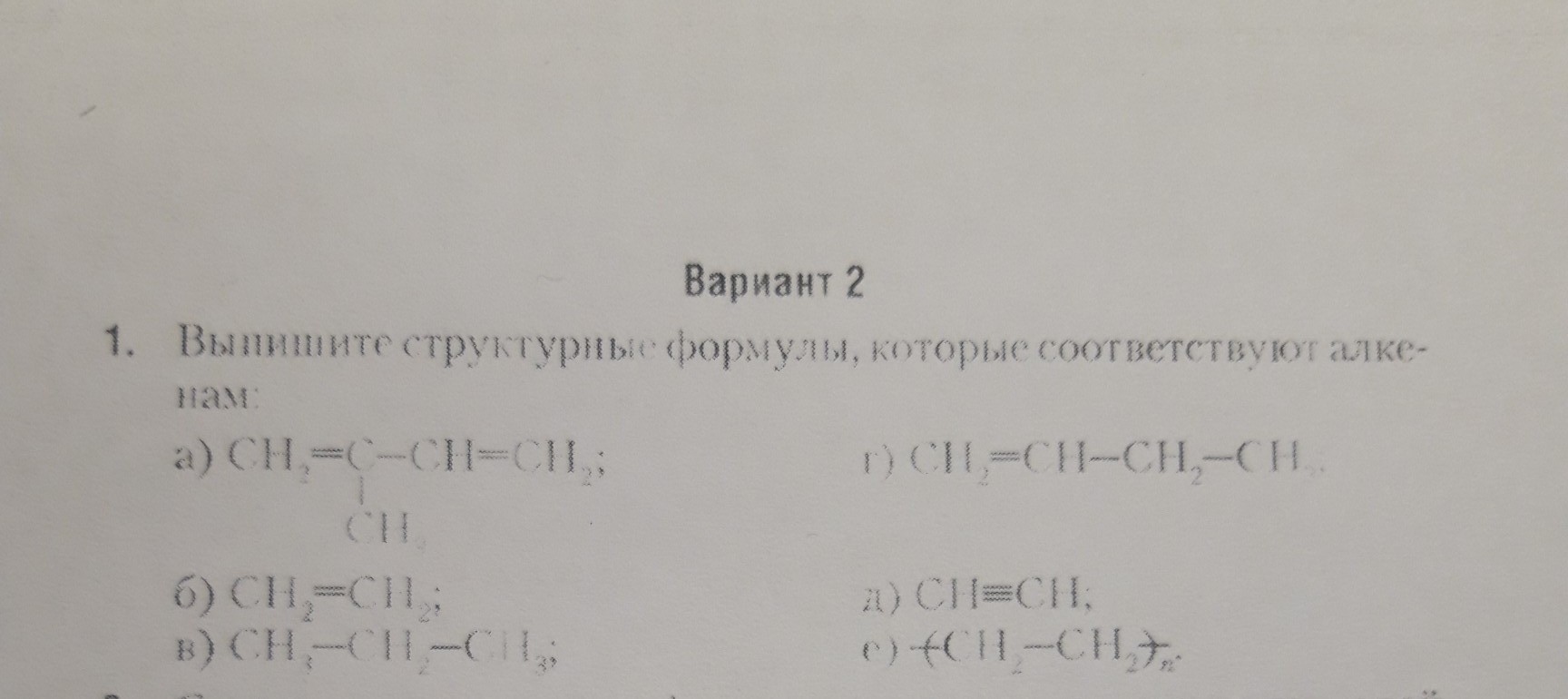Это ответы Б) и Г). А) - это алкадиен, В) - алкан, Д) - алкин, Е) - полимер, а Б) и Г) - алкины (алкины имеют только одну двойную связь).