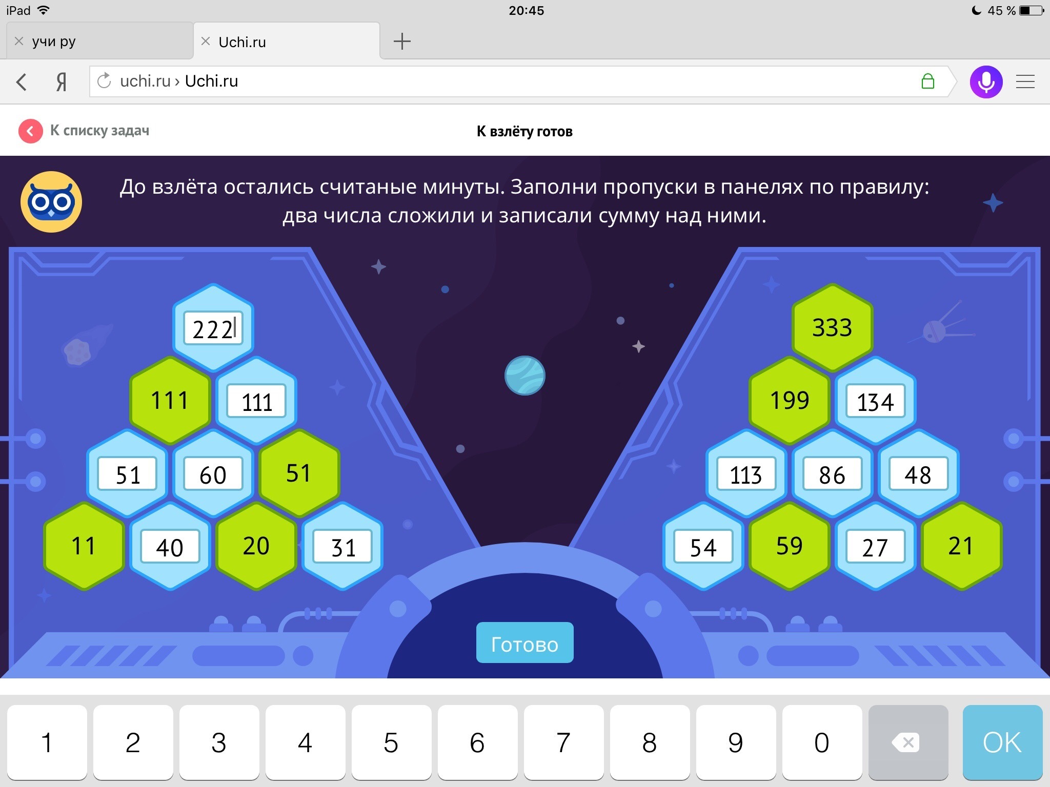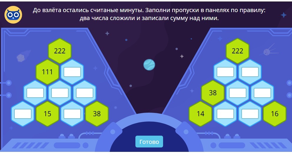 До взлета остались считанные минуты. Заполни пропуски в панелях по правилу: два числа сложили и записали сумму над ними. Задание выложено на учи. ру