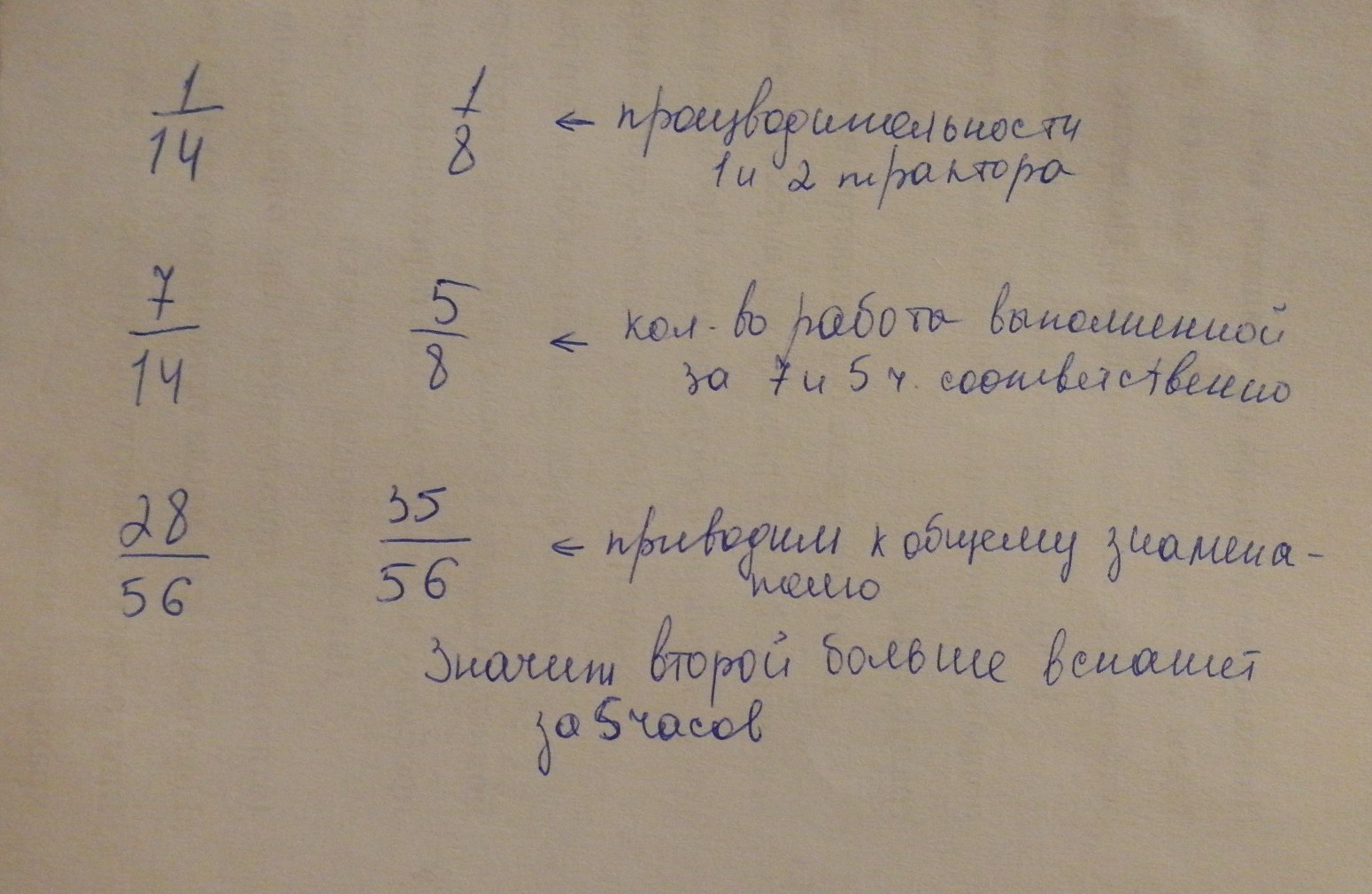 Один трактор может вспахать поле за 14 ч, а другой тот же участок за 8 ч. Какой трактор больше вспашет: первый за 7 ч или второй за 5 ч?