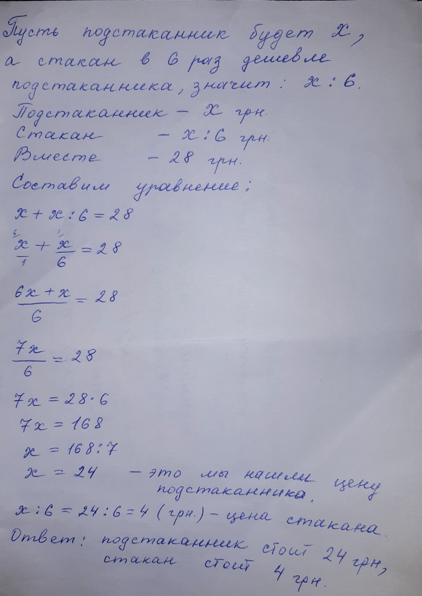 Помогите решить задачу. Стакан с подстаканником стоит 28 грн, причём стакан стоит в 6 раз дешевле. Сколько стоит стакан и сколько подстаканник?