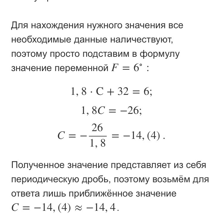 чтобы перевести значение температуры по шкале Цельсия в шкалу Фаренгейта пользуются формулой F=1,8С+ 32, где C градусы Цельсия в градусы Фаренгейта Какая температура по шкале Цельсия соответствует 6 градусов по шкале Фаренгейта Ответ округлите до десятых