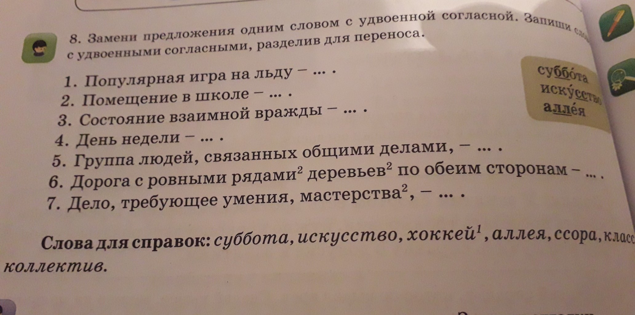 замени предложения одним словом с удвоенной согласной.запиши слова с удвоенными согласными ,разделив для переноса.