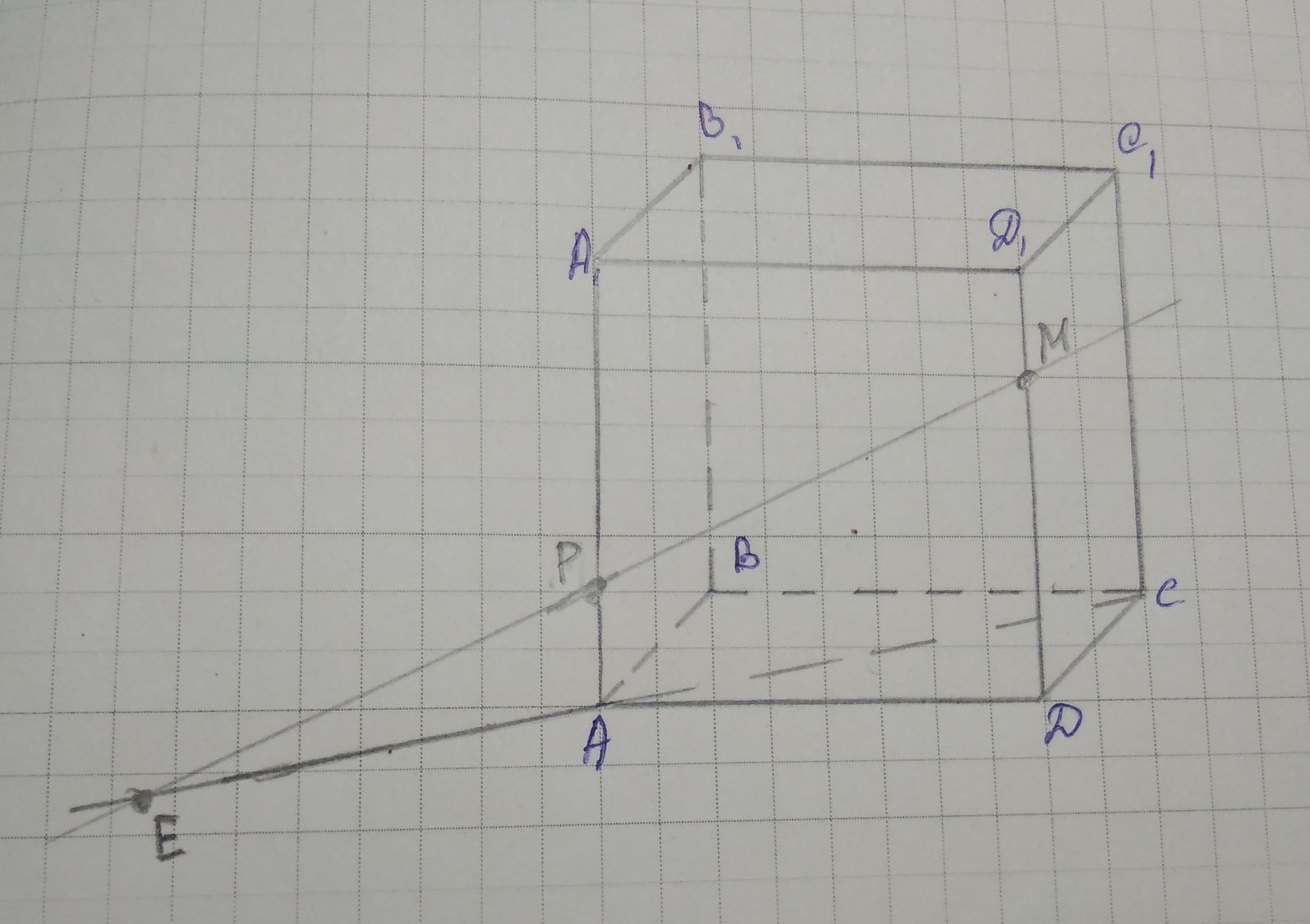 Дан куб ABCDA1B1C1D1 и точки P принадлежащая АА1, и М принадлежащая DD1. Постройте точку пересечения PM и плоскости ABC. Построение обоснуйте!